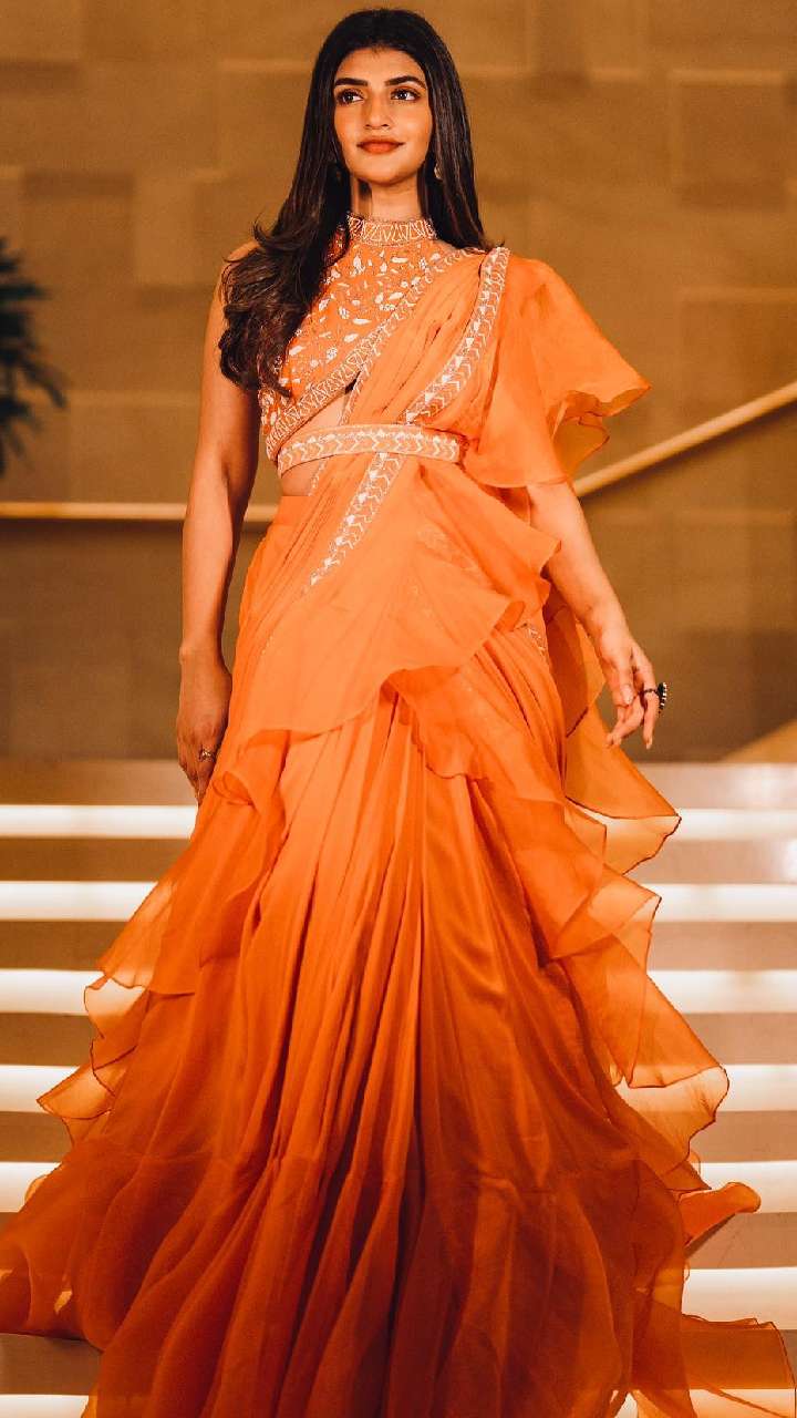 ऑरेंज कलर की नेट की साड़ी में श्रीलीला बहुत प्यारी लग रही हैं। एक्ट्रेस ने इस साड़ी के साथ बेल्ट भी पेयर किया है।
