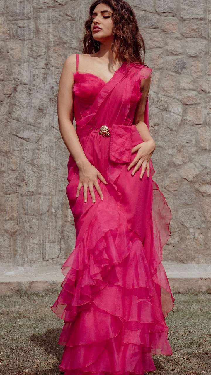 फिलहाल रफल साड़ी काफी ज्यादा ट्रेंड में चल रही हैं। आप भी एक्ट्रेस की तरह ही पिंक नेट की रफल साड़ी को कैरी कर सकती हैं।