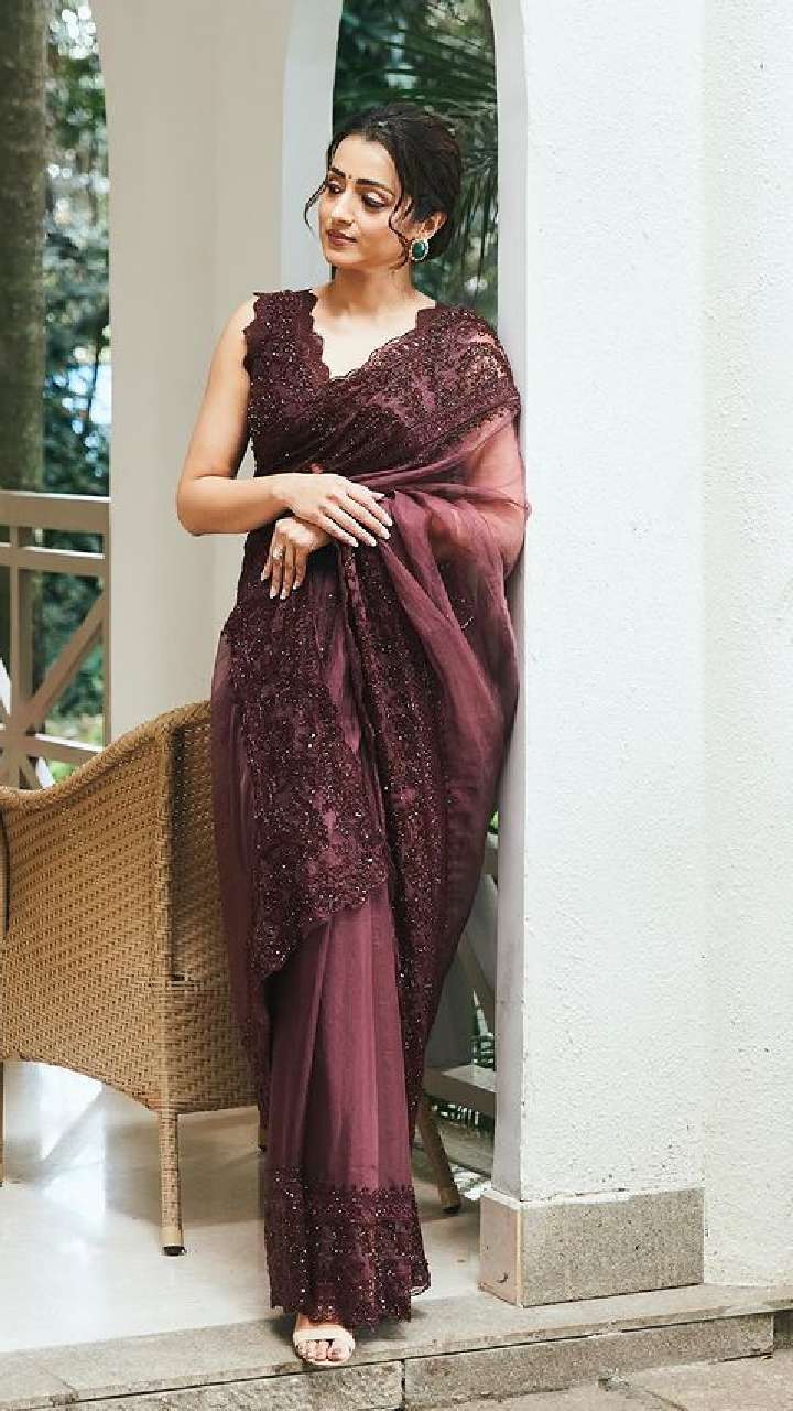 ब्लू साड़ी और ऑफ व्हाइट कलर के ब्लाउज में एक्ट्रेस का ये सिंपल सोबर लुक फैंस को बहुत पसंद है।