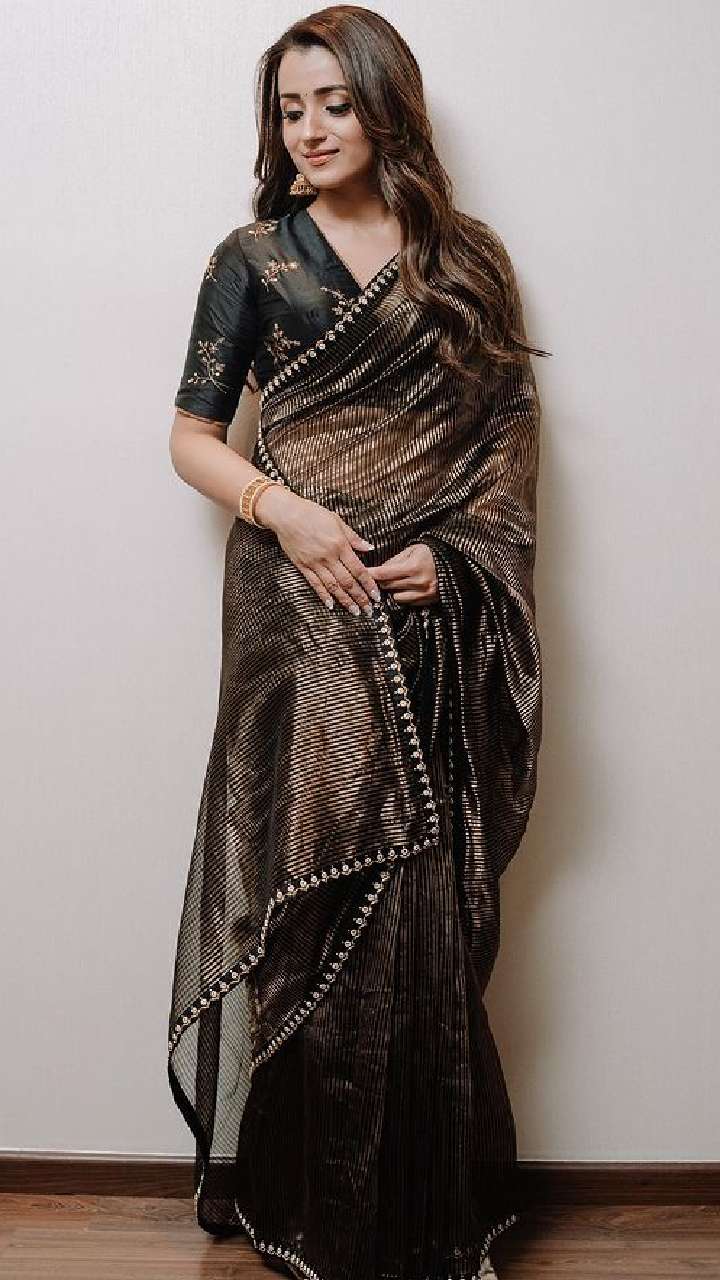 तृषा कृष्नन की ये ब्लैक साड़ी लुक को आप भी ट्राई कर सकते हैं। ब्लैक साड़ी में गोल्डन बॉडर ने लुक को अट्रैक्टिव बनाया है।