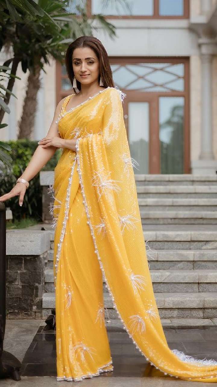 तृषा कृष्णन की इस येलो साड़ी में फेदर वर्क किया गया है। सिंपल सोबर लुक फैंस का दिल जीत रहा है।