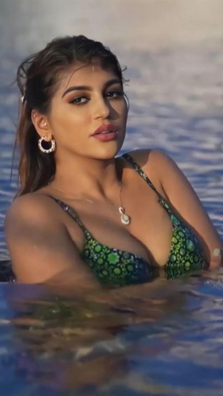 याशिका आनंद स्विमिंग पूल में बिकिनी पहने हॉट लग रही हैं।