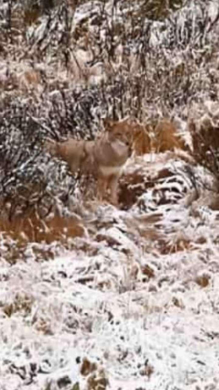 तस्वीर के दाई तरफ देखें, आपको भेड़िया नजर आ जाएगा। हालांकि पहली नजर में ढूंढना आसान नहीं क्योंकि भेड़िया भी पेड़ और ग्रास के कलर जैसी ही है।