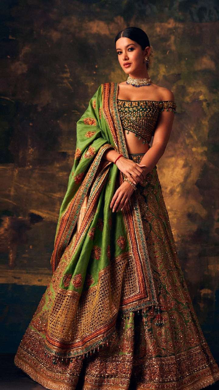 इस ग्रीन कलर के बनारसी लहंगे ऑफ शोल्डर चोली में शनाया एकदम अप्सरा लग रही हैं। एक्ट्रेस ने मैचिंग नेकपीस और बन हेयर स्टाइल से अपना लुक कंप्लीट किया है।