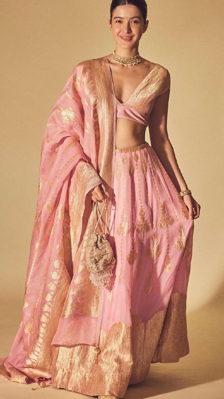 इस पिंक के जरी बॉर्डर वाले लहंगे में शनाया काफी खूबसूरत लग रही हैं। आप किसी पुरानी सिल्क साड़ी से इस तरह का लहंगा बनवा सकती हैं।
