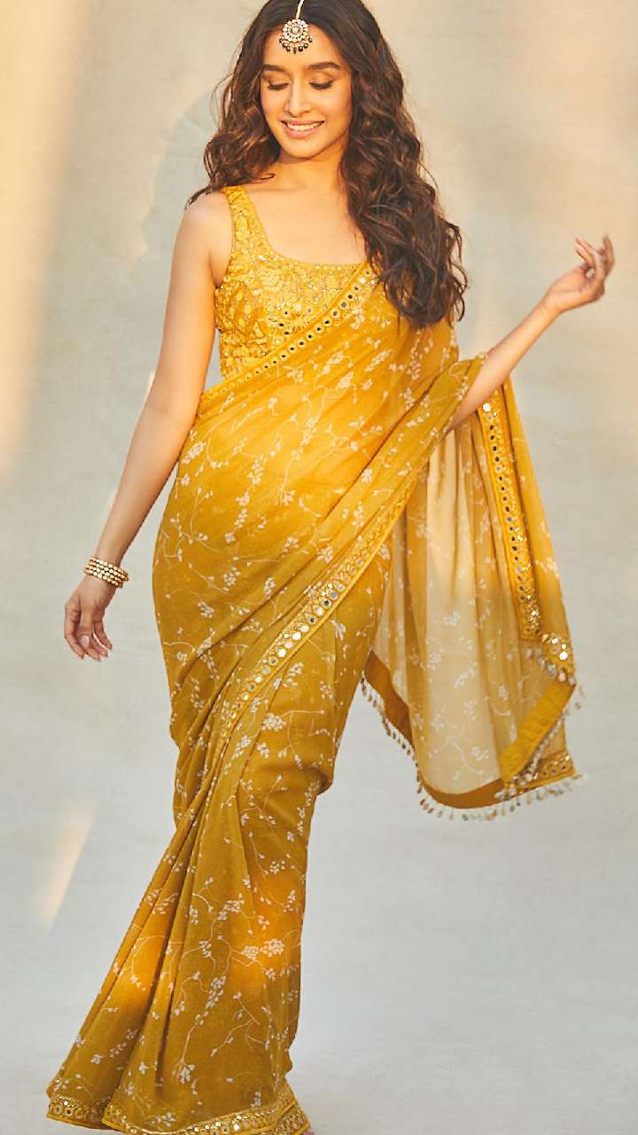 श्रद्धा कपूर की येलो मिरर बॉर्डर साड़ी कट स्लीव्स ब्लाउज लुक हल्दी फंक्शन के लिए बेस्ट चॉइस है। इसके साथ मांग टीका विद कर्ली हेयर ट्राई किया जा सकता है।
