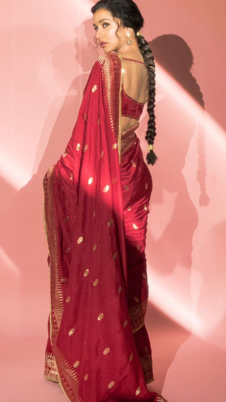 यदि आप रेड लवर हैं तो डीवा की रेड सिल्क गोल्डन बॉर्डर साड़ी बैक डोरी ब्लाउज लुक आपको काफी पसंद आएगा। इसके साथ आप भी लांग ब्रेड हेयर स्टाइल पेयर करें।