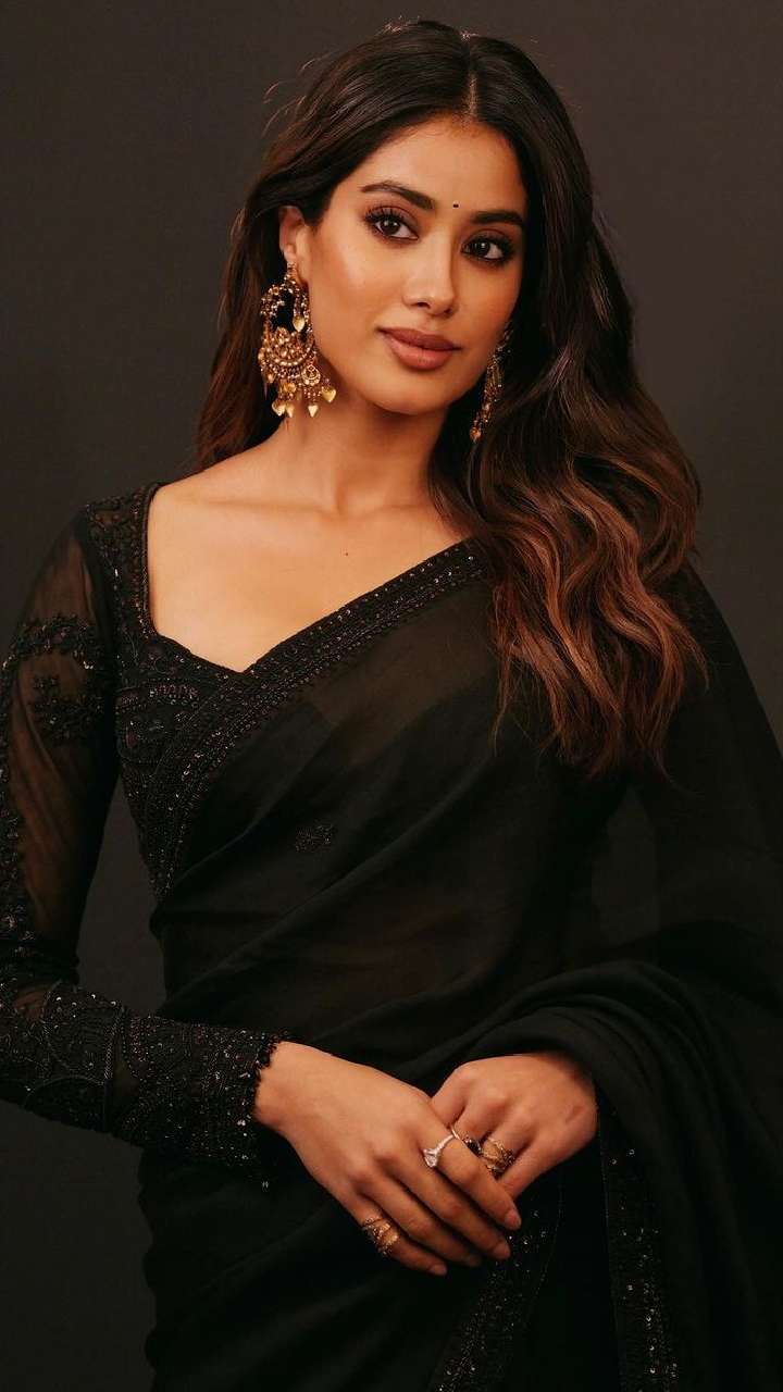 सुंदर डिजाइन वाले हैवी ब्लाउज के साथ आप ऐसी प्लेन ब्लैक साड़ी आराम से किसी के भी फंक्शन में कैरी कर सकती हैं। जाह्नवी की ये एलिगेंट साड़ी यंग गर्ल्स किसी पार्टी में पहनकर ग्लैमरस लुक से सकती हैं। आप ऐसी हैवी ब्लाउज वाली ब्लैक साड़ियों पर लाइट गोल्डन ज्वेलरी पहनकर ओर भी ज्यादा खूबसूरत लगेंगी।