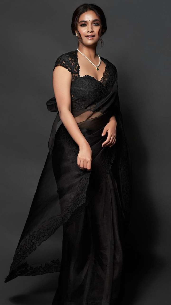 लड़कियों को ब्लैक कलर काफी पसंद होता हैं। अगर आपको एकदम सिंपल विद स्टाइलिश ब्लाउज साड़ी पहनने का मन है, तो एक्ट्रेस का यह लुक आपको लिए एकदम परफेक्ट हैं। आप इस साड़ी के साथ डायमंड या पर्ल ज्वेलरी पहनकर रॉयल लुक ले सकती हैं।