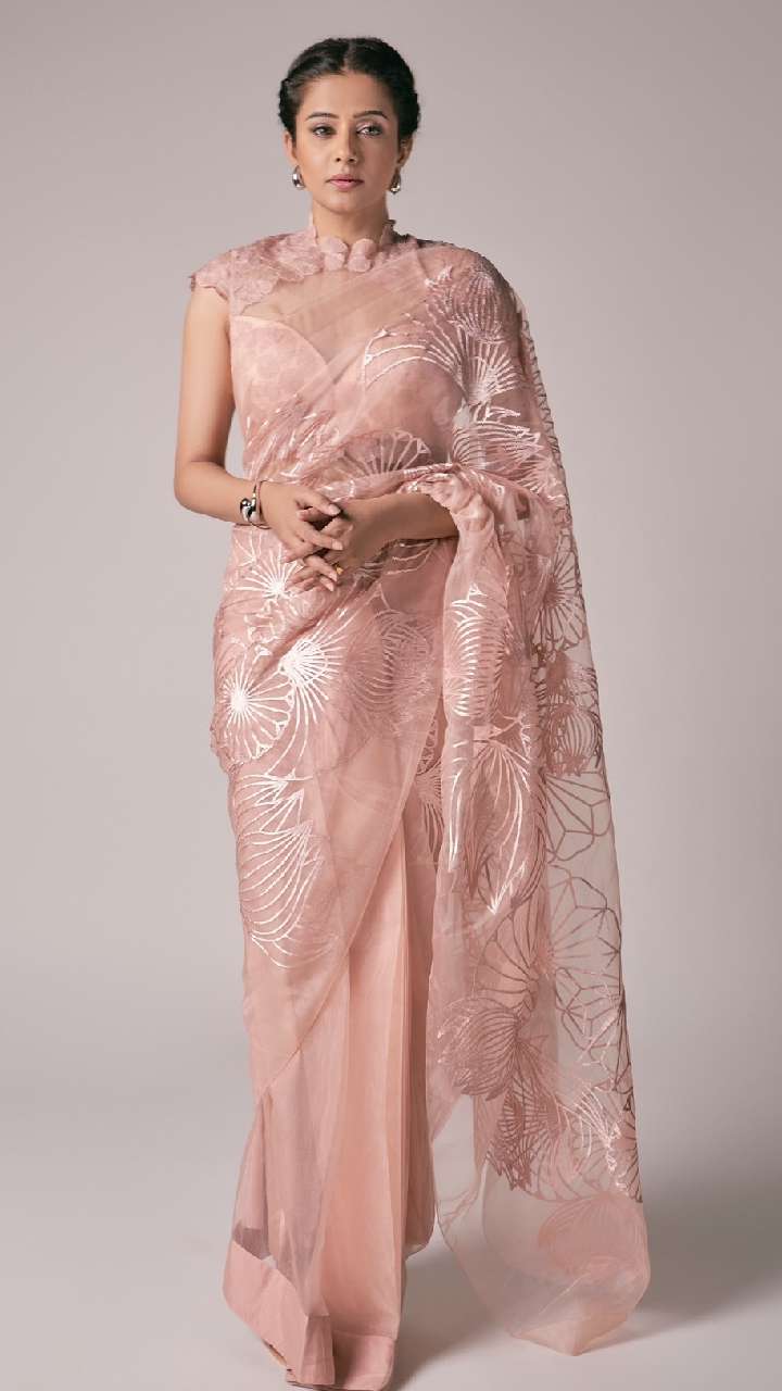 एक्ट्रेस ने डिजाइनर नेट साड़ी संग राउंड नेक ब्लाउज को स्टाइल किया है, जो डिसेंट लुक दे रहा है। आप सिंपल साड़ी संग ऐसे ब्लाउज डिजाइन को ट्राई कर सकती हैं।