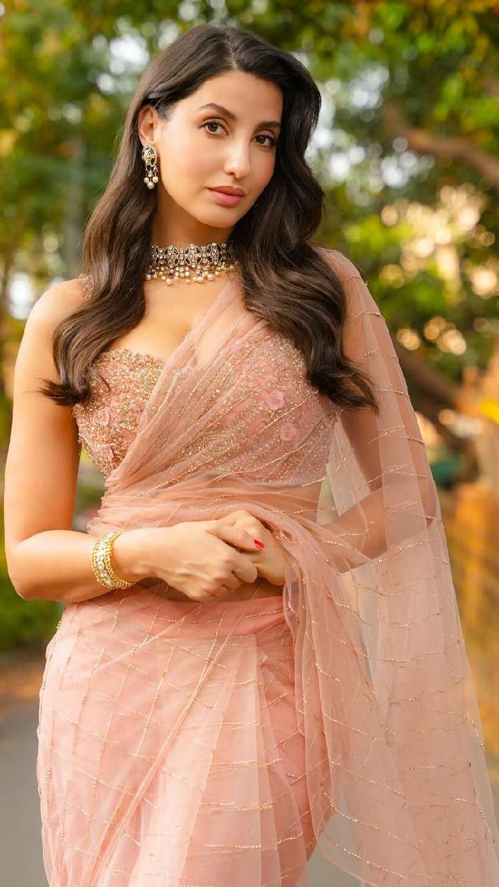 नोरा फतेही ने नेट की खूबसूरत साड़ी के पल्ले को स्टाइलिश लुक दिया है। आप भी इस स्टाइल को कॉपी कर सकती हैं।