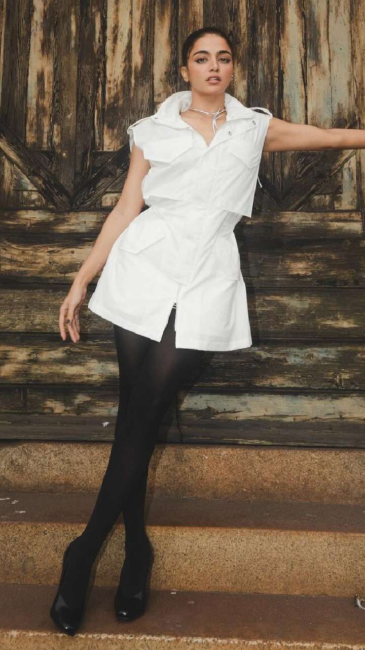 एक्ट्रेस ने ब्लैक स्टॉकिंग्स के साथ व्हाइट शॉर्ट ड्रेस को स्टाइल किया है, जो बॉसी लुक के लिए एकदम परफेक्ट है। आप बोल्ड मेकअप और कर्ली हेयर स्टाइल के साथ एक्ट्रेस के इस आउटफिट को कॉपी कर सकती हैं।