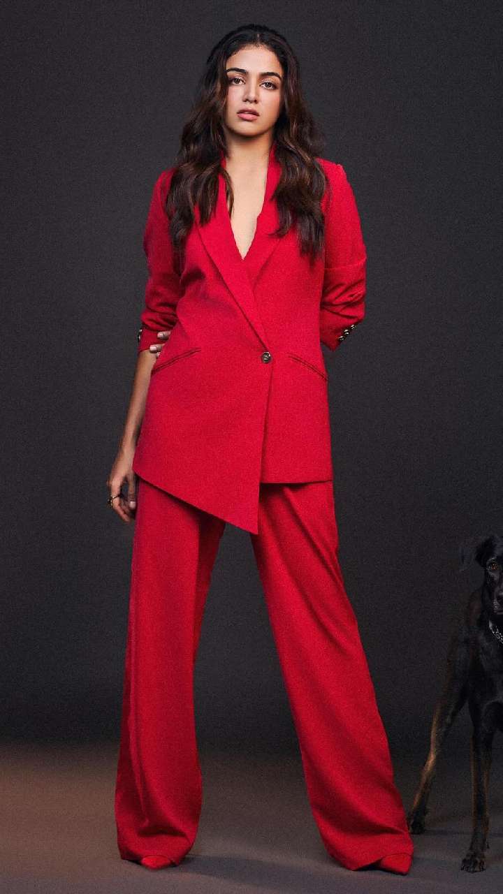 अगर आप ऑफिस पार्टी में कुछ स्टाइलिश और बॉसी लुक देने वाला आउटफिट पहनना चाहती हैं, तो Wamiqa का यह रेड आउटफिट लुक एकदम बेस्ट है। लुक को कम्पलीट करने के लिए आप बोल्ड मेकअप ट्राई करें।