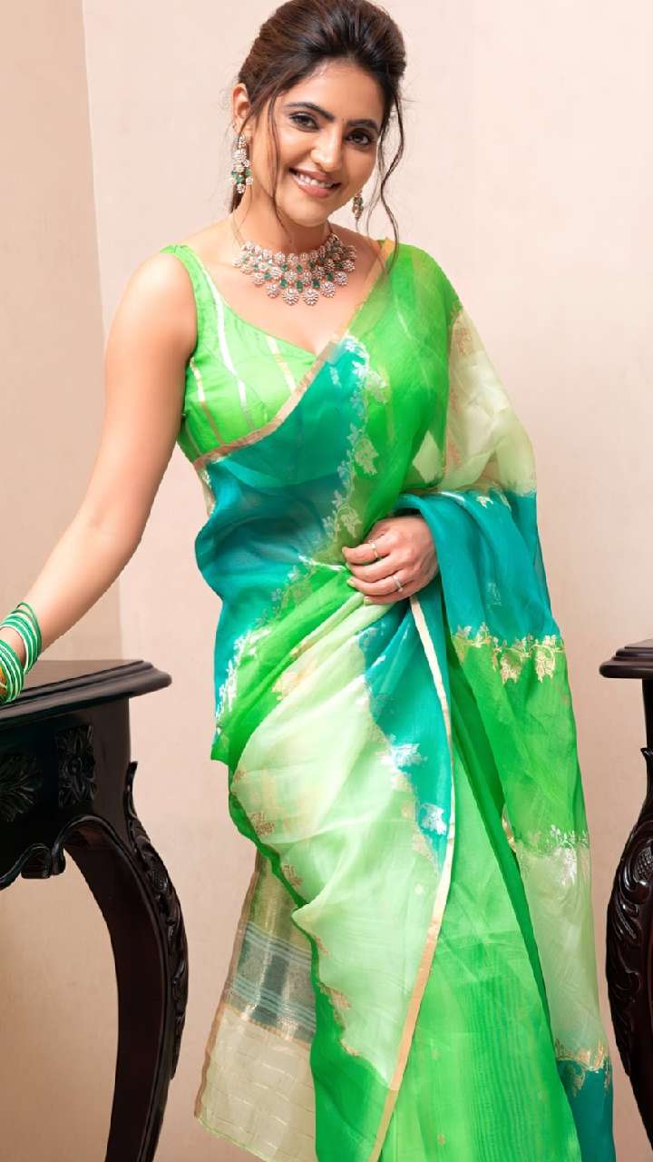 एक्ट्रेस ने फ्लोरल ग्रीन कलर की रेडी टू वियर साड़ी को खुले बालों के साथ स्टाइल किया है, जो काफी एलिगेंट लुक दे रही है। आप इस ससुराल में न्यूड मेकअप के साथ पहन सकती हैं।