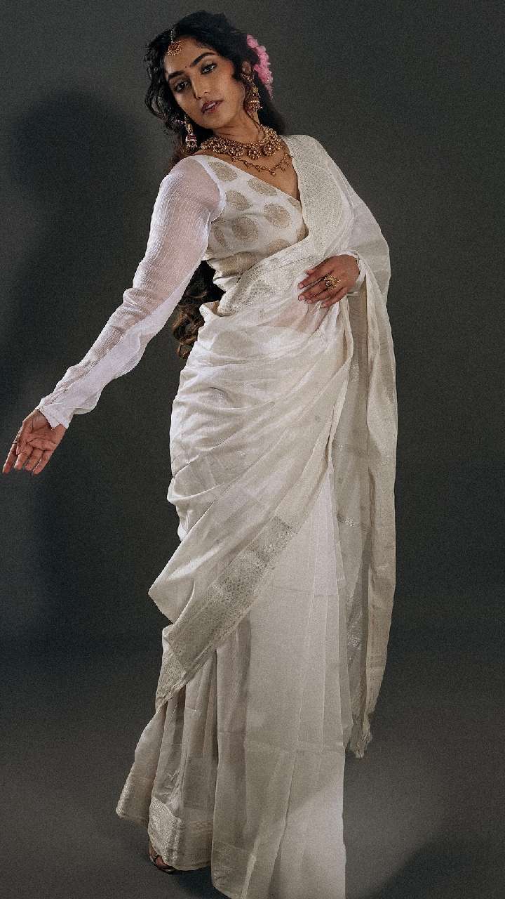Reba इस प्लेन कॉटन व्हाइट साड़ी में बेहद खूबसूरत लग रही हैं। उन्होंने साड़ी के साथ रॉयल ज्वेलरी कैरी करी है। आप डार्क मेकअप और बोल्ड लिपस्टिक शेड के साथ साड़ी को पहन सकती हैं।