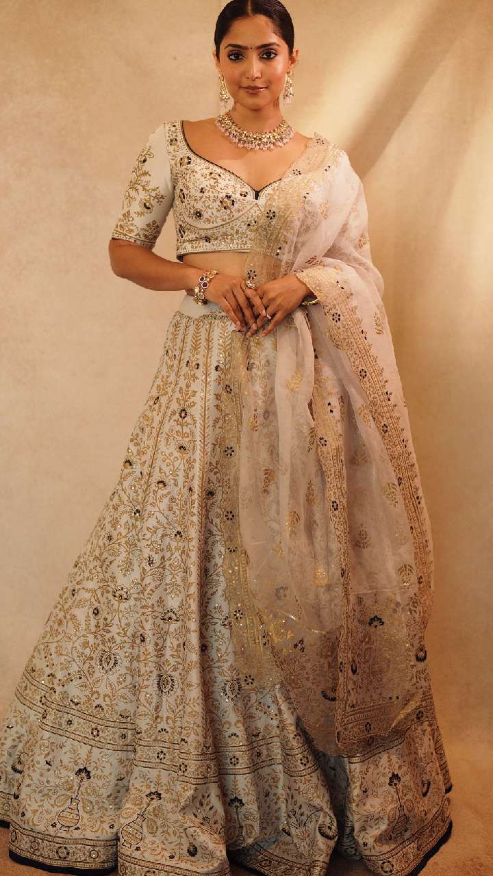 अगर आप शादियों में साड़ी पहनकर बोर हो गई हैं, तो एक्ट्रेस का यह डिजाइनर लहंगा आपके लिए बेस्ट ऑप्शन है। एक्ट्रेस के इस लुक को यंग गर्ल्स ऑक्सीडाइज्ड झुमके और मेसी बन हेयर स्टाइल के साथ ट्राई कर सकती हैं।