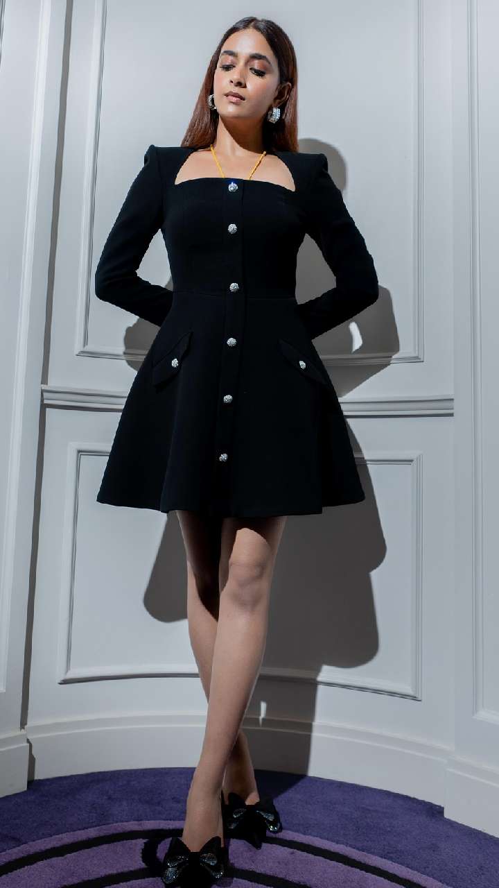 एक्ट्रेस ने शाइनी ब्लेजर, स्कर्ट और ब्रालेट टॉप के साथ ग्लैमरस लुक कैरी किया है। आप लुक को कंप्लीट करने के लिए हॉफ टाई बन हेयर स्टाइल को ट्राई कर सकती हैं।