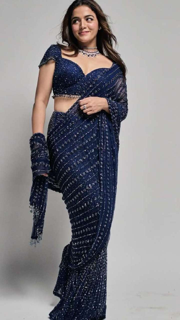 महिलाएं एक्ट्रेस की यह स्टोन वर्क साड़ी को शादी और फंक्शन में मेसी बन हेयर स्टाइल के साथ कैरी कर सकती हैं। ऐसा करने से आपका लुक अट्रैक्टिव और स्टाइलिश लगेगा।