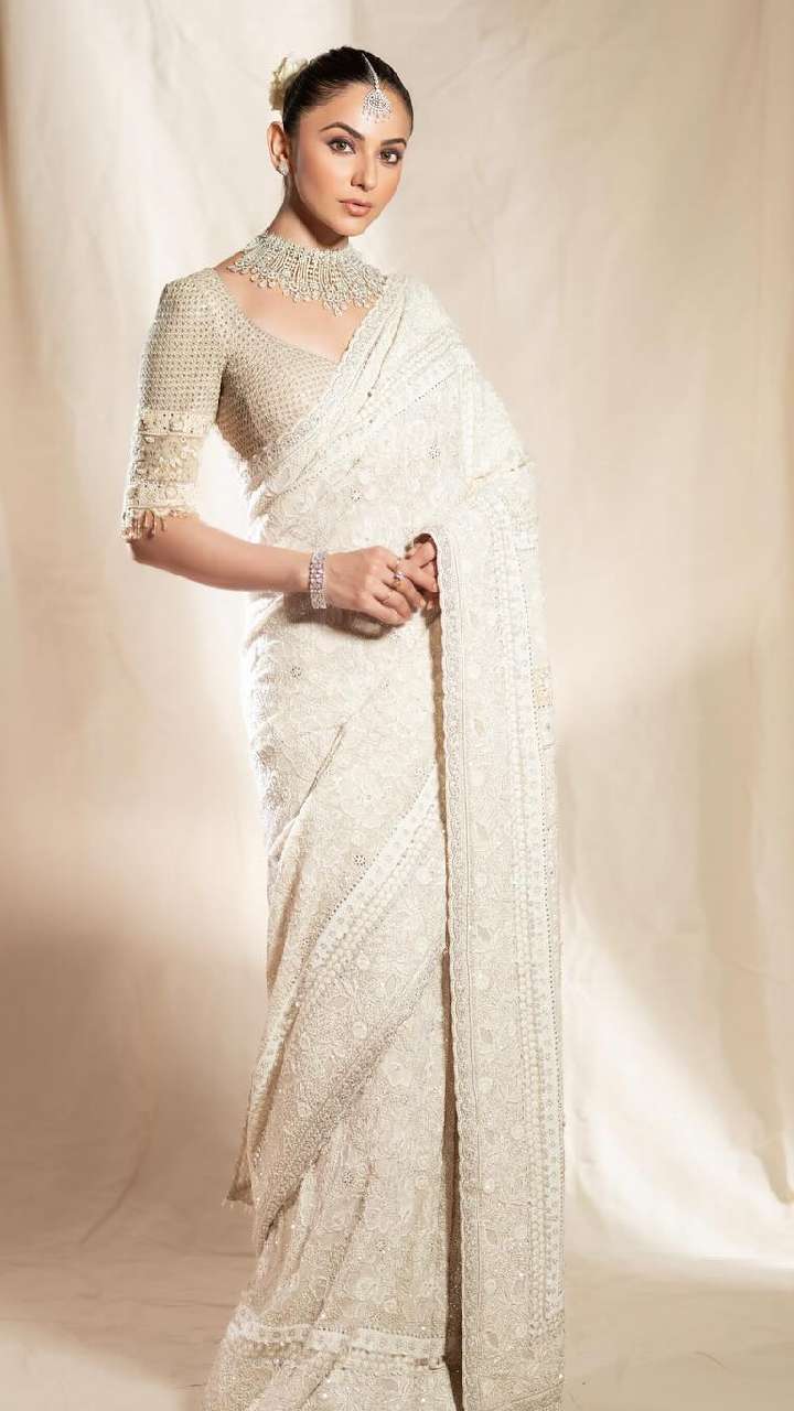 Rakul की प्लेन साड़ी में मिरर वर्क बॉर्डर काफी स्टाइलिश लुक दे रहा है। साथ ही, उनके इयररिंग्स लुक को अट्रैक्टिव बना रहे है। आप साड़ी संग फुल स्लीव्स मिरर वर्क ब्लाउज को ट्राई कर सकती हैं।