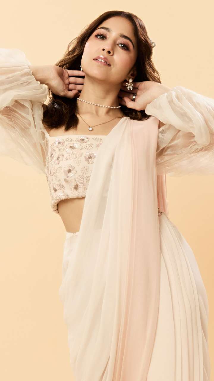 एक्ट्रेस ने व्हाइट प्लेन साड़ी के साथ ऑफ शोल्डर और बैलून स्लीव्स वाले ब्लाउज को स्टाइल किया है, जो उनके लुक को अट्रैक्टिव बना रहा है। कॉलेज फेयरवेल में गॉर्जियस दिखने के लिए आप इस स्टाइल को कॉपी करें।