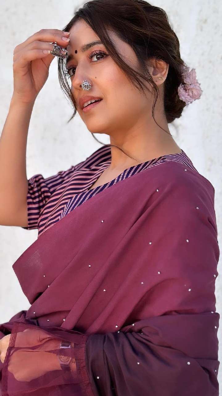 अट्रैक्टिव लुक कैरी करने के लिए आप एक्ट्रेस की इस लाइट वेटेड साड़ी को टाइट बन हेयर स्टाइल और डार्क मेकअप के साथ पहन सकती हैं।