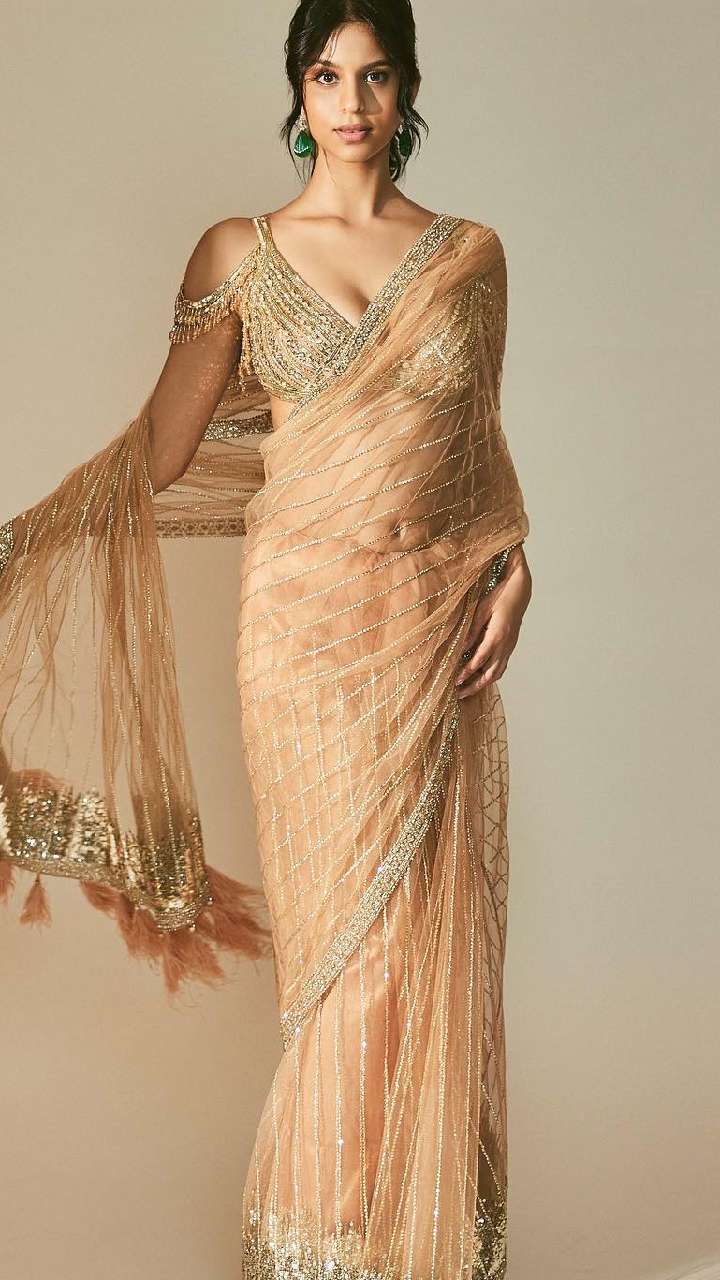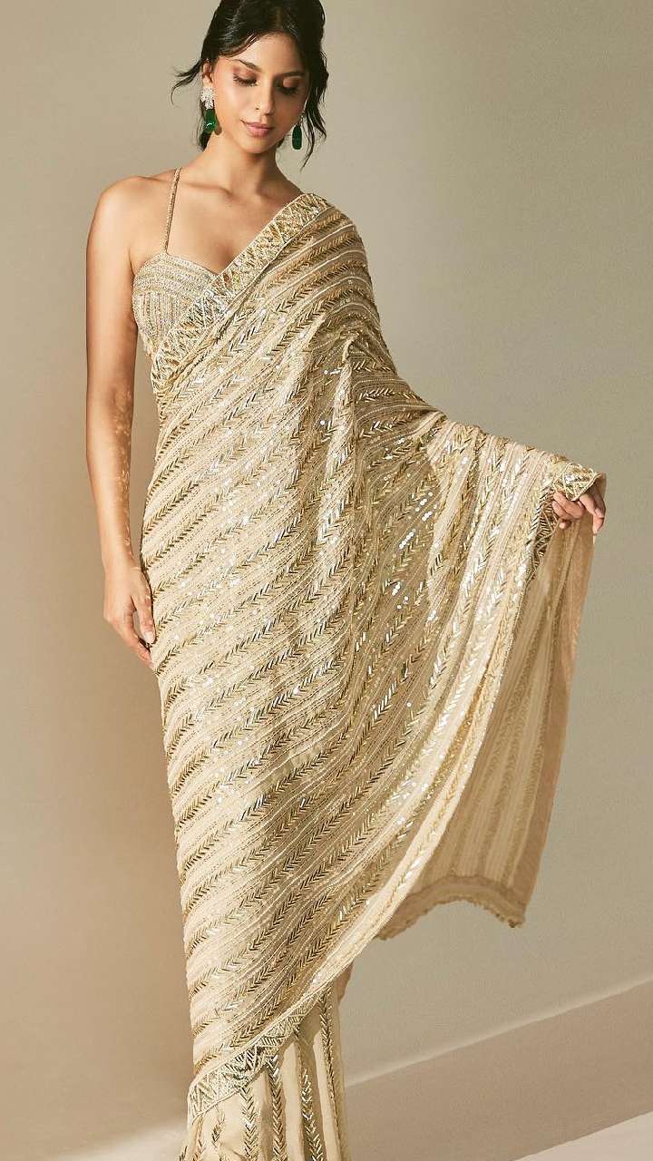 मनीष मल्होत्रा की डिजाइन की ऑफ व्हाइट साड़ी में सुहाना की खूबसूरती देखने लायक है।