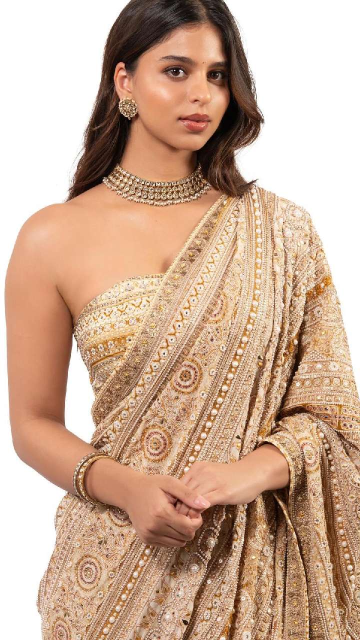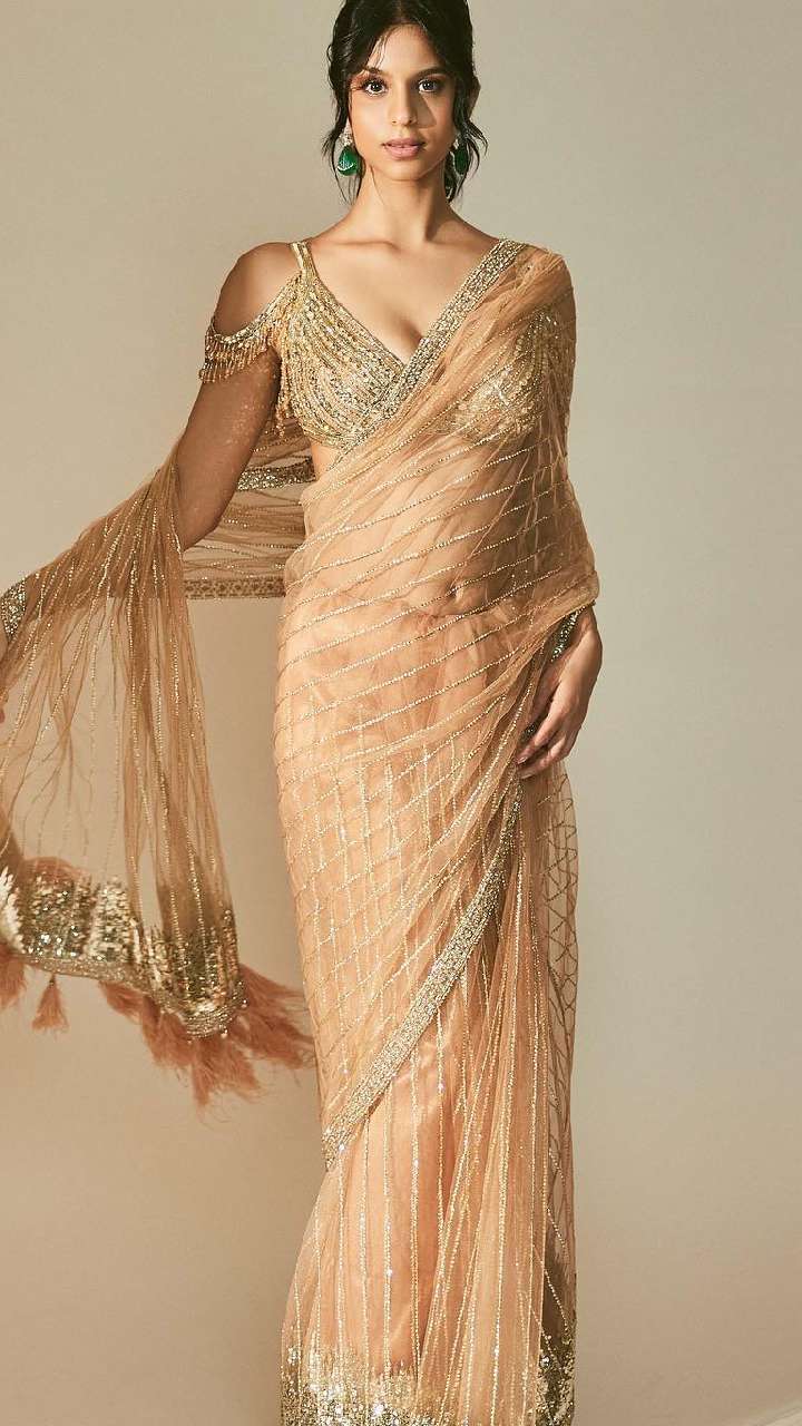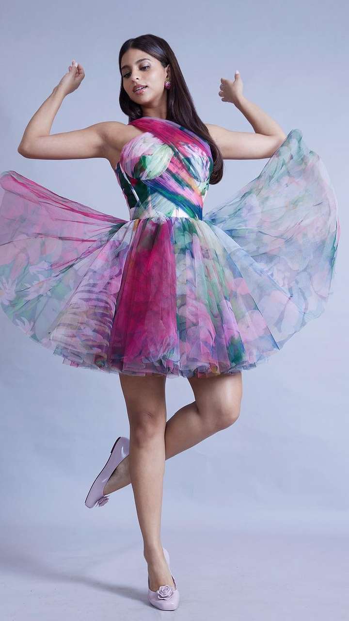 मल्टीकलर की टिशू ड्रेस नाइट पार्टी के लिए एकदम परफेक्ट है। जिसको कैरी करके आप भी सुहाना की तरह ग्लैमरस लग रही हैं।