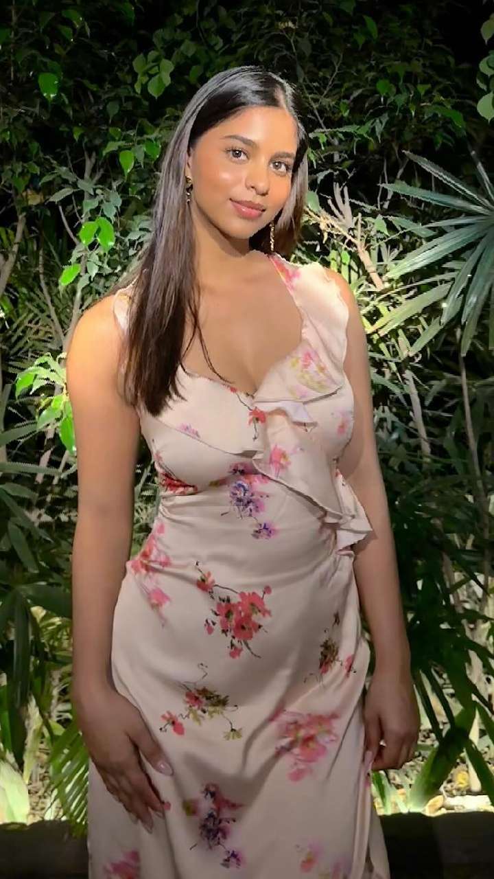 सुहाना पीच कलर की साटन फ्लोरल ड्रेस में ब्यूटीफुल लग रही हैं। ऐसे प्रिंट समर सीजन में काफी कूल लुक देते हैं।