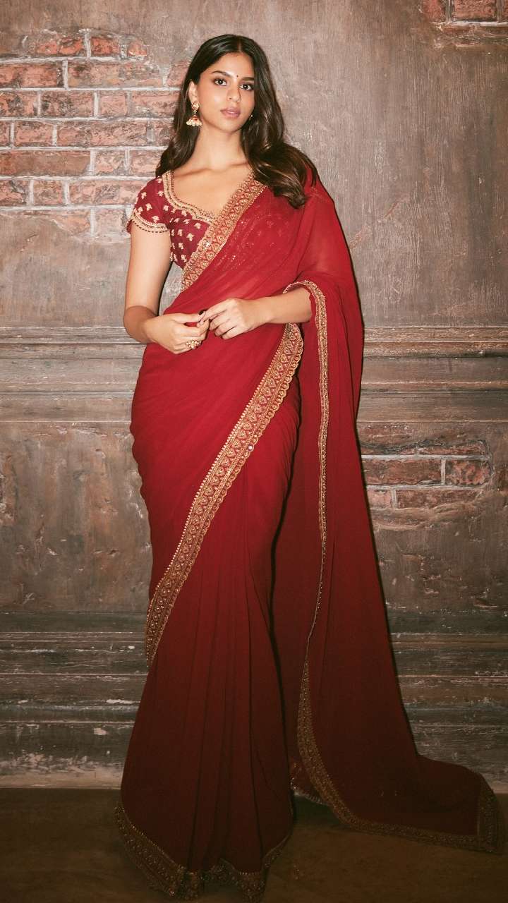 शाह रुख खान की बेटी सुहाना खान इस ब्लू कलर की साड़ी में माशाल्लाह लग रही हैं। यंग गर्ल्स पर इस तरह की साड़ी शानदार लगेगी।