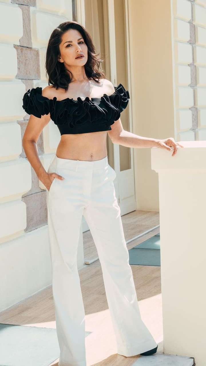 ब्लैक ऑफ शोल्डर टॉप और व्हाइट पैंट में सनी लियोनी बेहद ब्यूटीफुल लग रहीं हैं। एक्ट्रेस के इस लुक को आप भी कैरी कर सकते हैं।