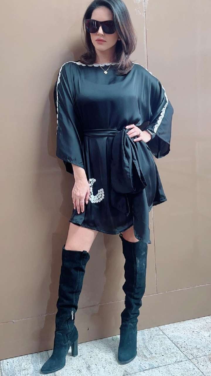इस न्यू ईयर पार्टी के लिए सनी की जीरो नेक ड्रेस लॉन्ग बूट लुक काफी सिज़लिंग लुक दे रहा है।