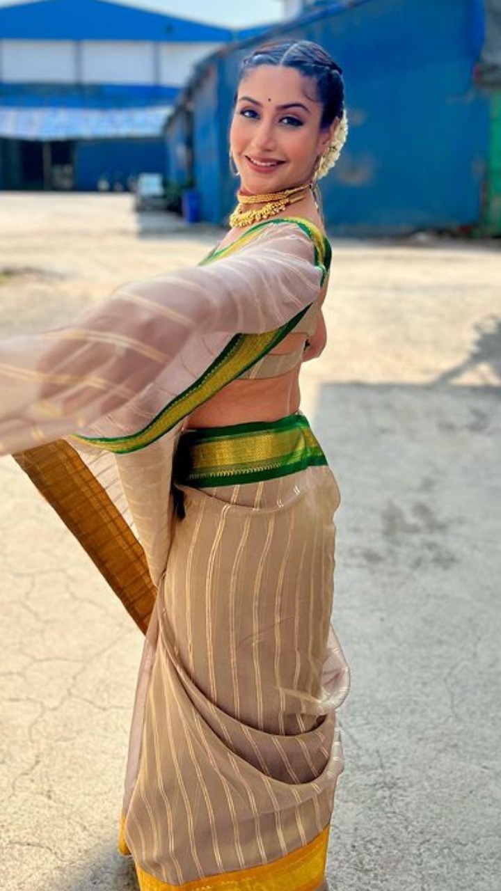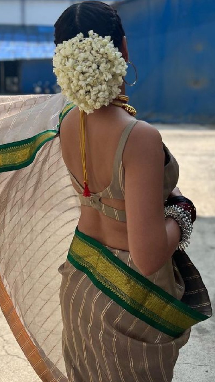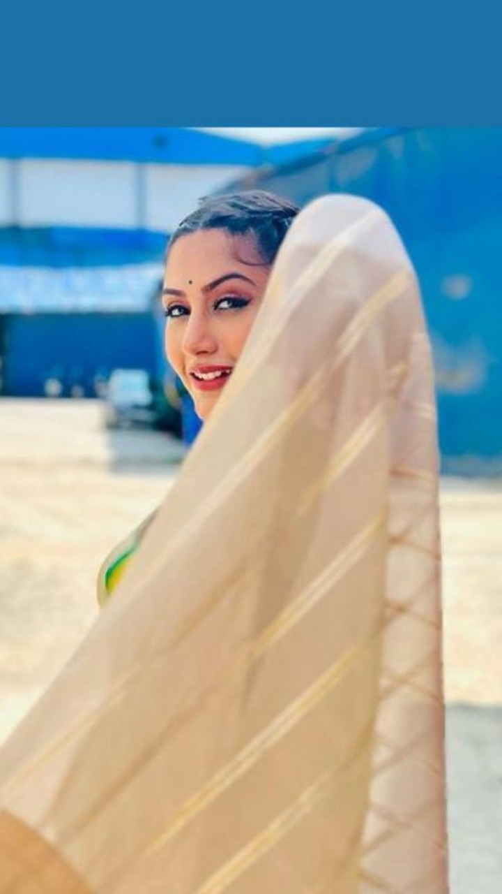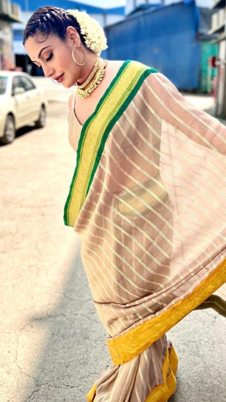 एक्ट्रेस ने लेटेस्ट पोस्ट में ऑफ व्हाइट कलर की कॉटन की साड़ी पहनी हुई हैं और बालों में गजरा लगाया है।