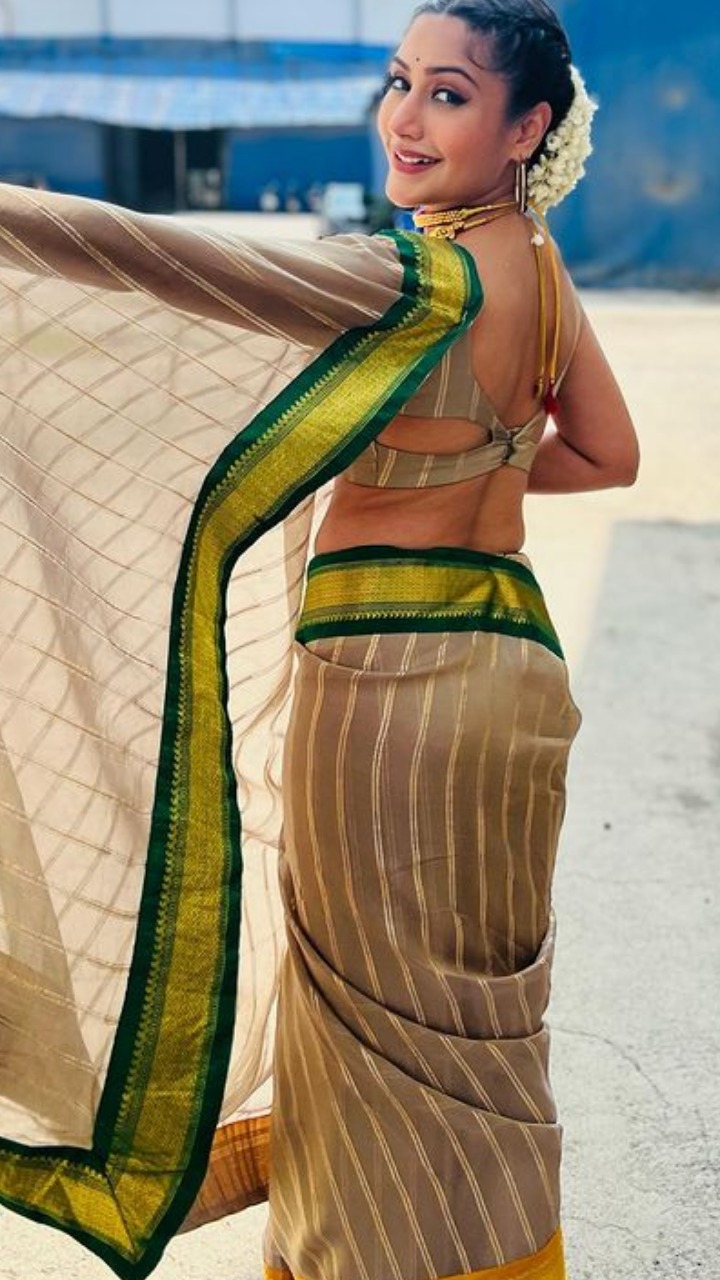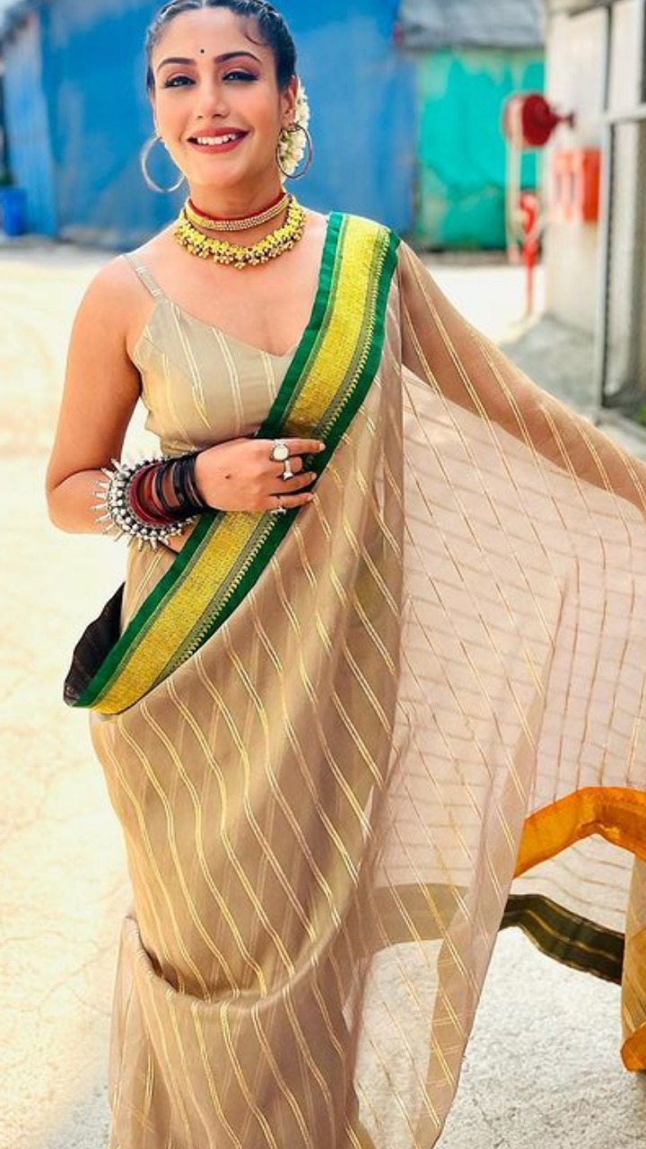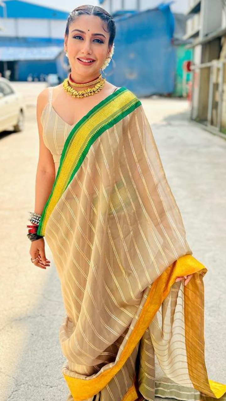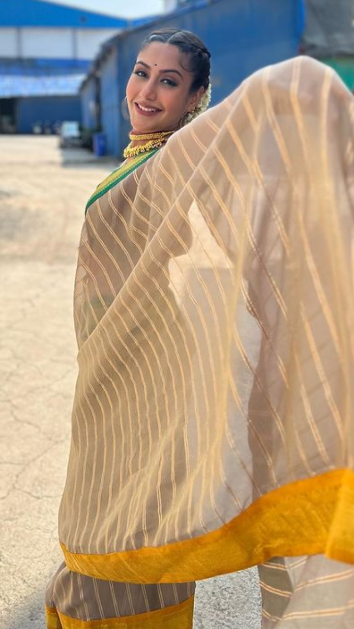 एक्ट्रेस ने लेटेस्ट पोस्ट में ऑफ व्हाइट कलर की कॉटन की साड़ी पहनी हुई हैं और बालों में गजरा लगाया है।