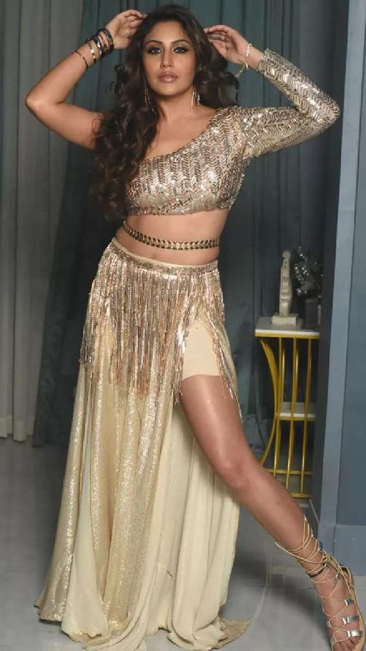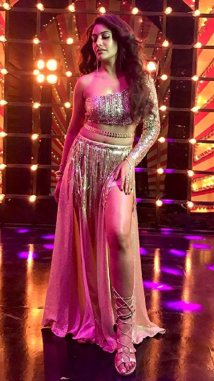 डीवा इस वन शोल्डर शिमरी टॉप संग हाई स्लिट स्कर्ट में बेहद स्टाइलिश दिख रही हैं।