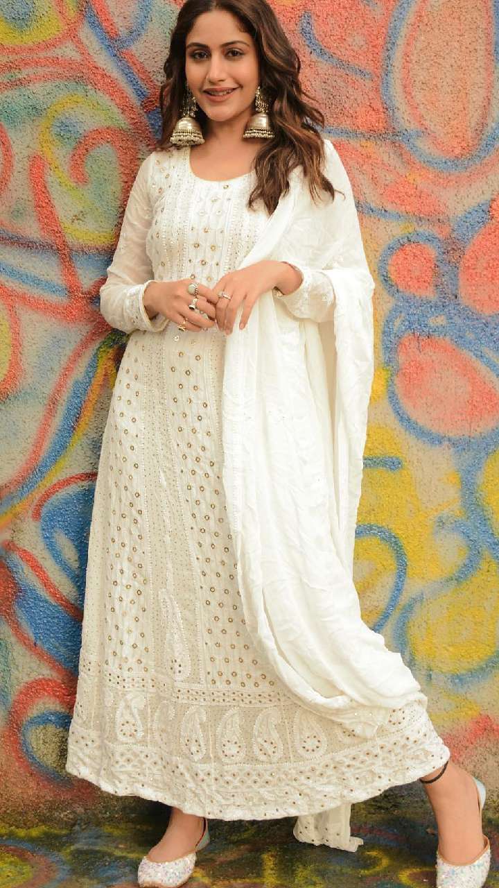 आप एक्ट्रेस के जैसा व्हाइट अनारकली सूट से भी खुद को खूबसूरत बना सकती हैं। इसके संग बिग ऑक्सीडाइज झुमके काफी सूट कर रहे हैं।