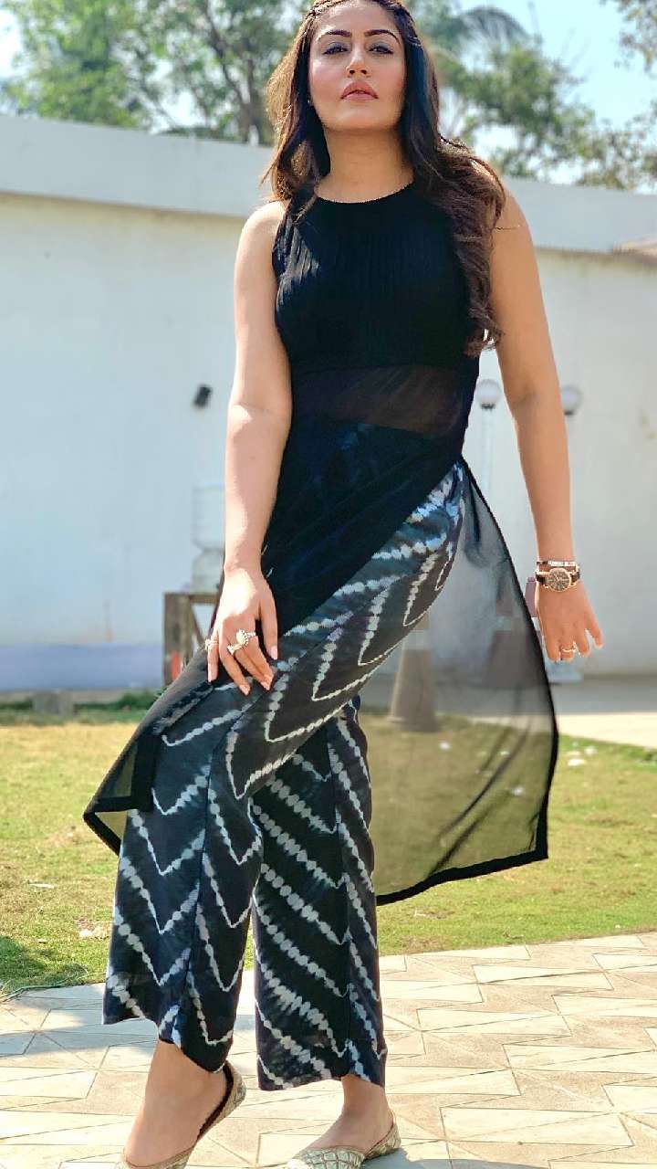सुरभि चंदना ब्लैक कलर की प्लेन कॉटन कुर्ती विद प्रिंटेड प्लाजो में काफी स्मार्ट लग रही हैं। ऑफिस में वियर करने के लिए ऐसे सूट बेस्ट रहते हैं।