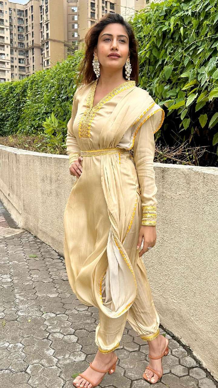 सुरभि का लाइट क्रीम कलर साटन धोती स्टाइल सलवार-सूट लुक आपके ऑफिस के लिए बेस्ट है। आप इसे ऑफिस में किसी भी खास दिन पहनकर जा सकती हैं।