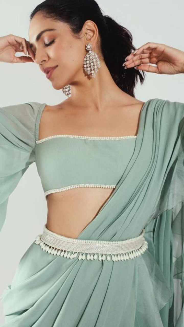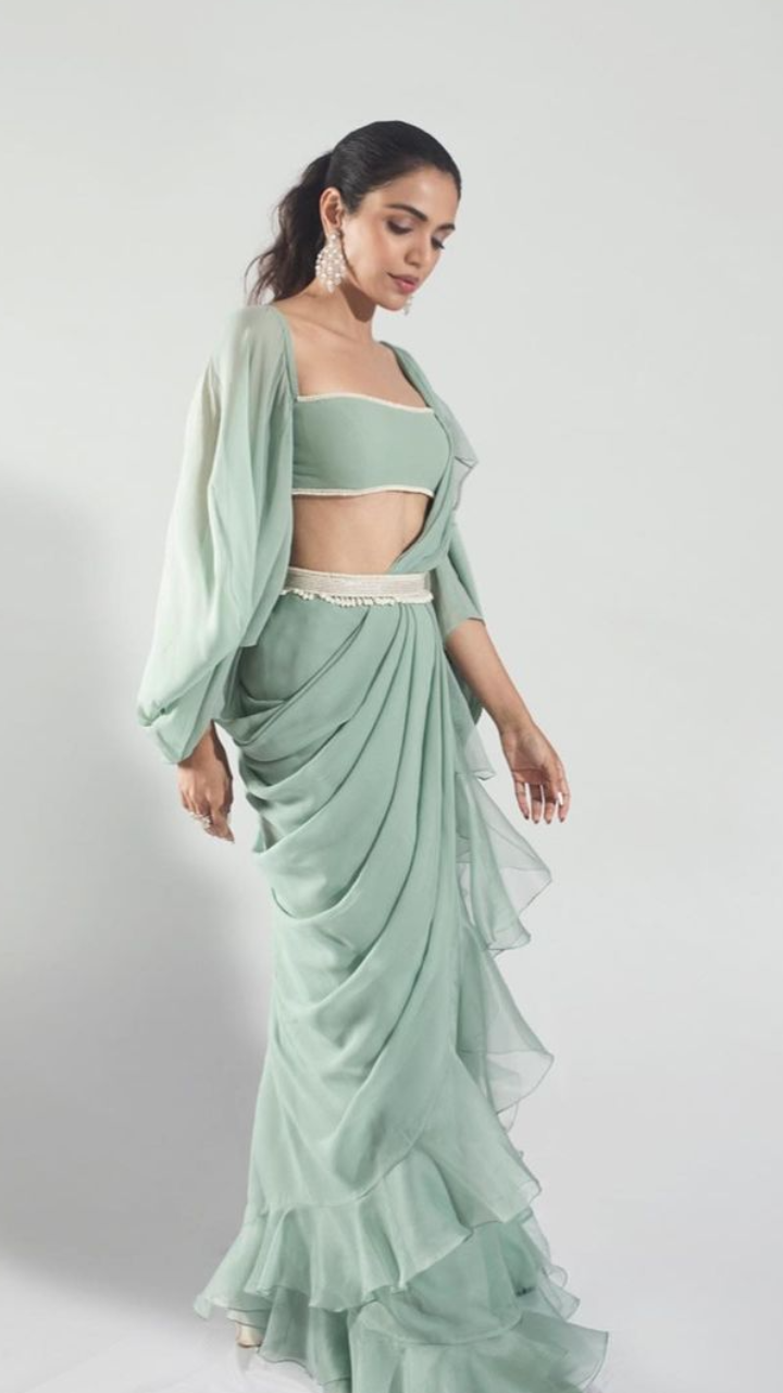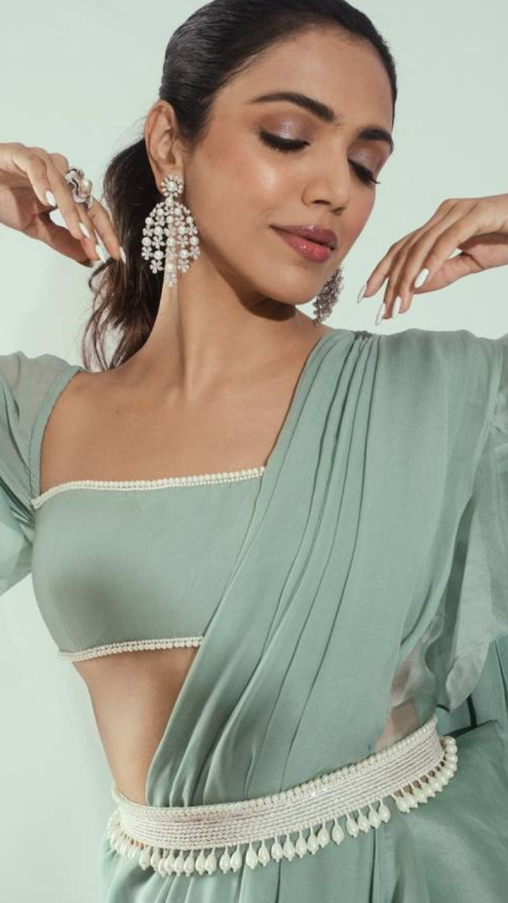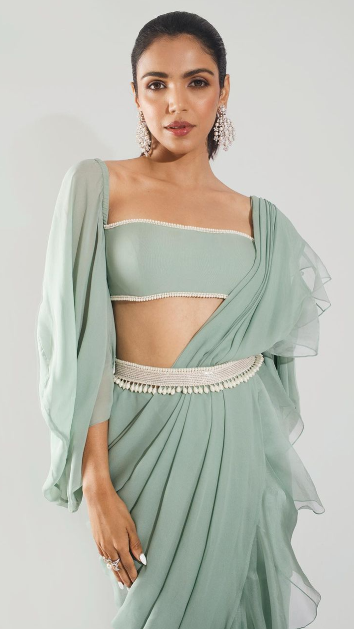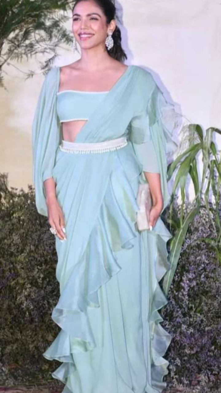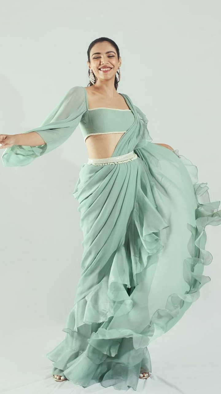 श्रिया ने लेटेस्ट फोटोज शेयर की हैं जिसमें उन्होंने ब्लू रफल साड़ी पहनी है और इसके साथ मैचिंग बेल्ट लगाई हुई है।
