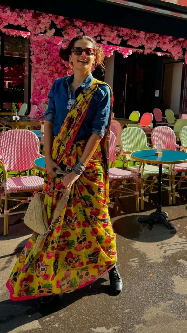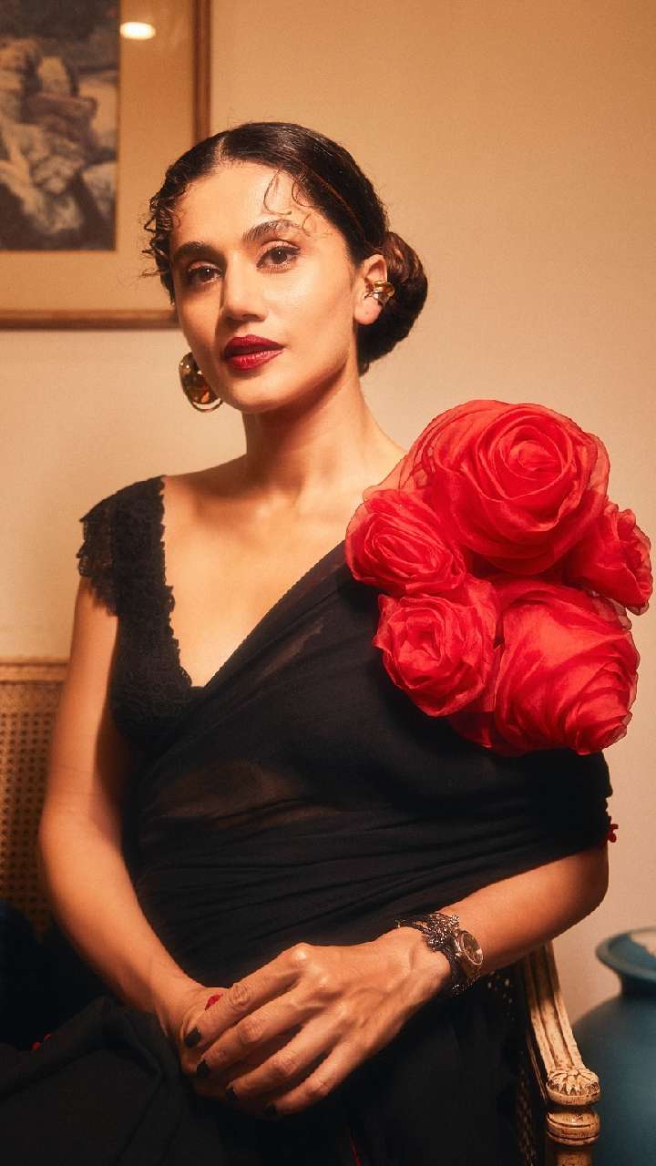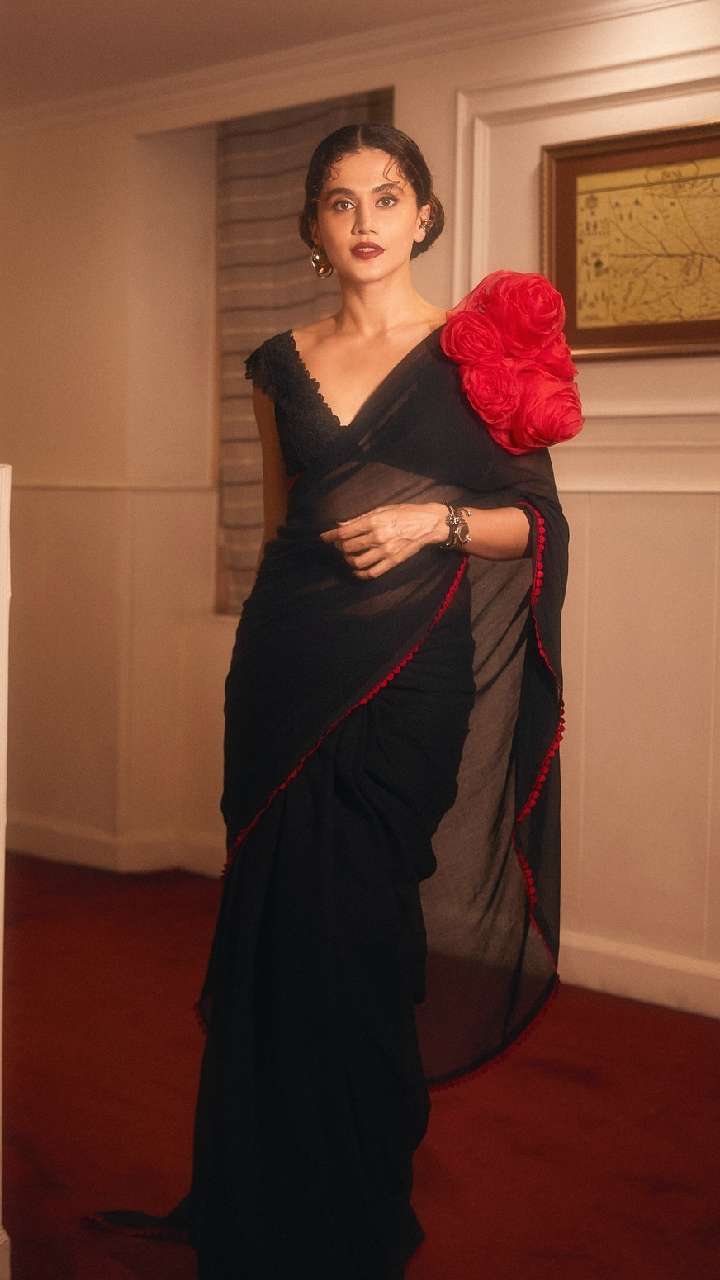 तापसी पन्नू सोशल मीडिया पर काफी ज्यादा एक्टिव रहती हैं। हाल ही में एक्ट्रेस ने ब्लैक कलर की प्लेन साड़ी में अपना लुक शेयर किया था।