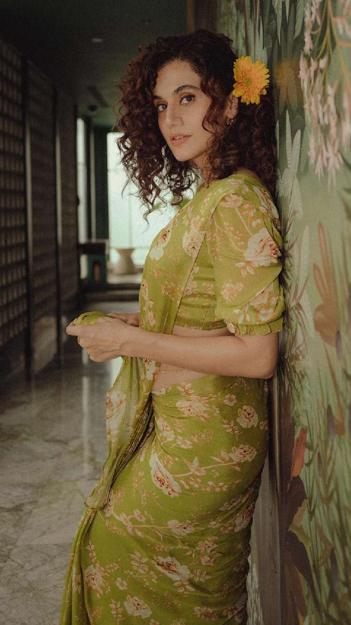 अगर आप प्रिंटेड साड़ी कैरी करना पसंद करती हैं तो आप तापसी पन्नू के इस लुक को कॉपी कर सकती हैं। ग्रीन प्रिंटेड साड़ी में तापसी कमाल लग रही हैं।