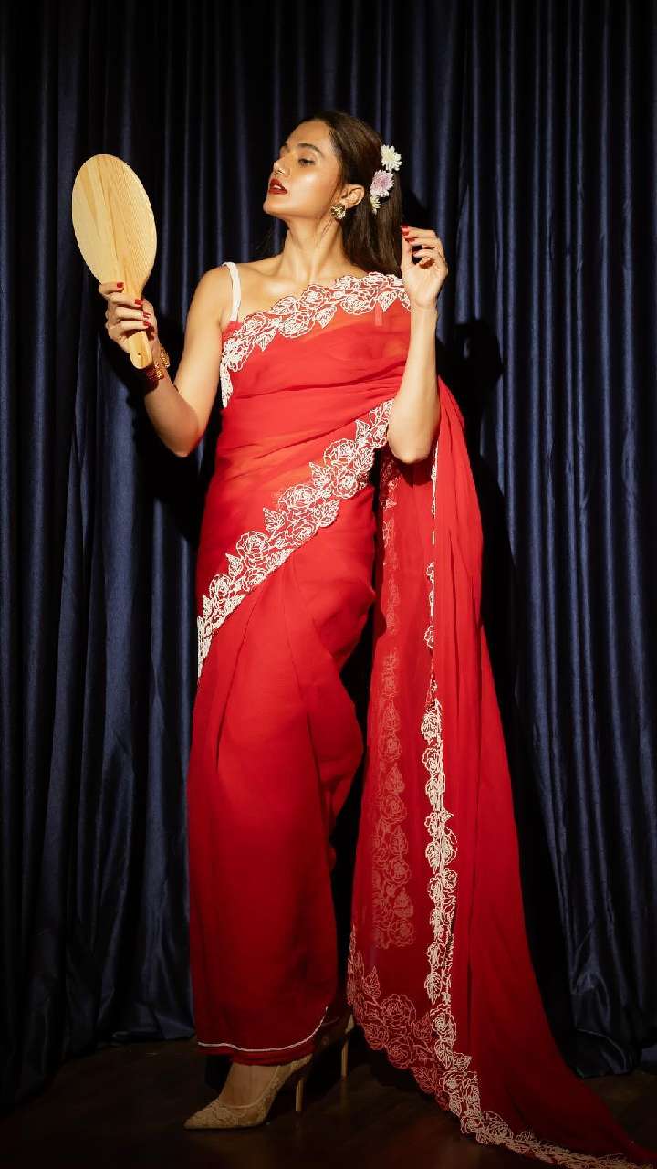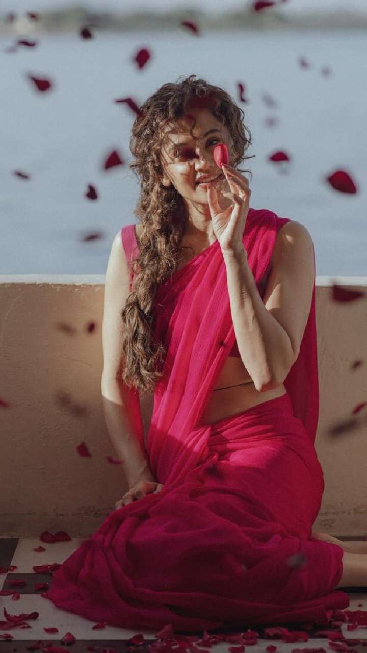 रेड कलर की इस साड़ी में तापसी पन्नू का लुक काफी शानदार लग रहा है। इस साड़ी की बॉर्डर पर व्हाइट लेस लगाई गई है।