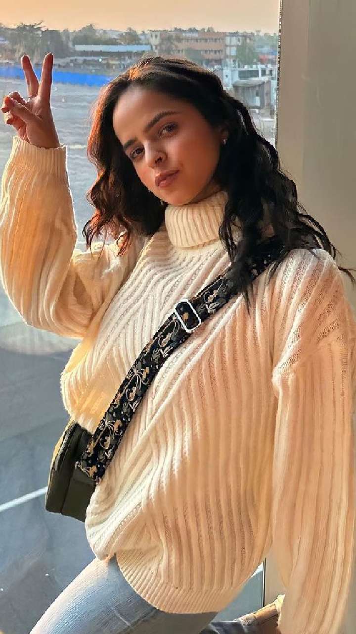 तस्वीर में एक्ट्रेस ने व्हाइट कलर का हाईनेक स्वेटर और जींस पहन रखा हैं।