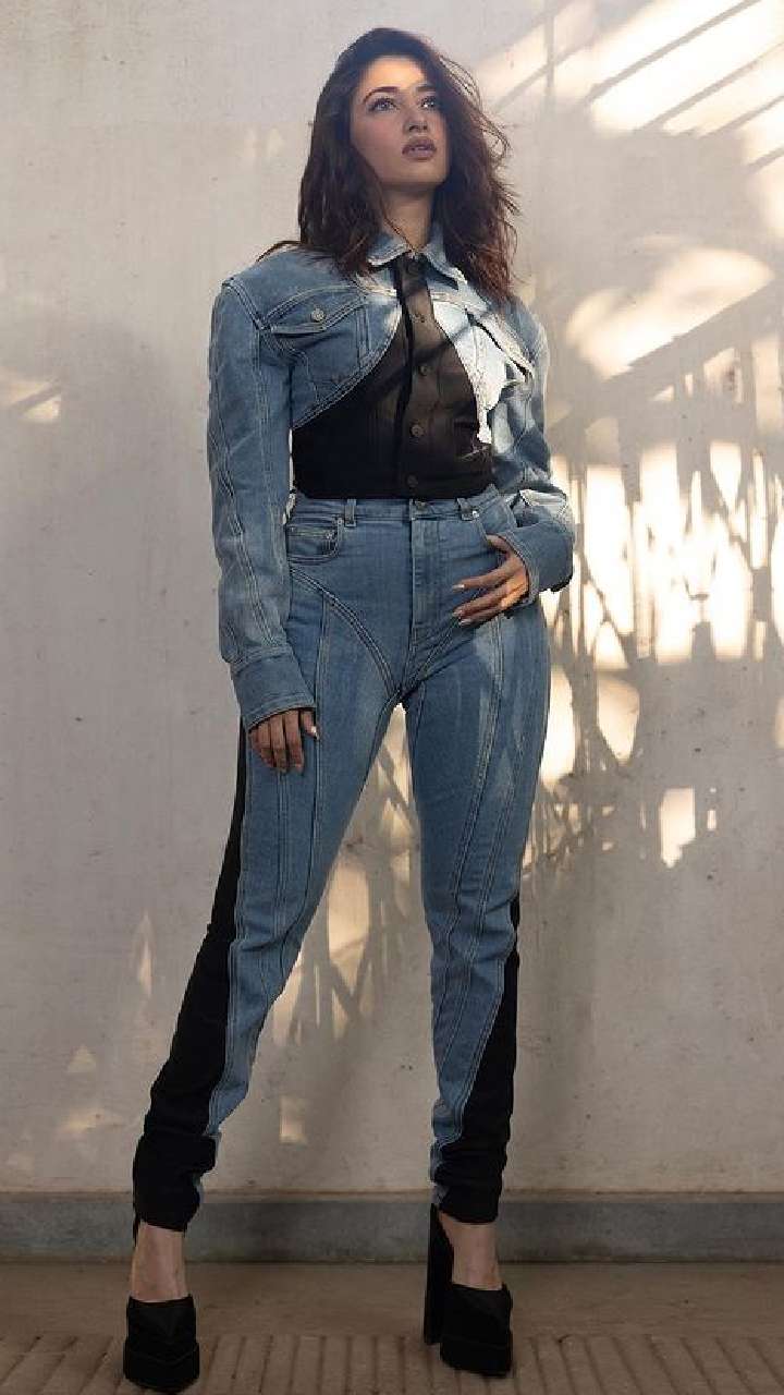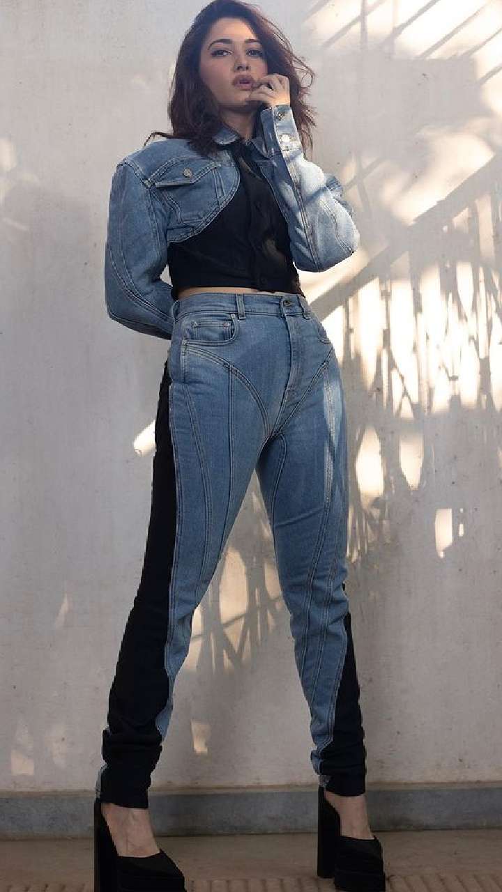 तमन्ना ने इस डेनिम आउटफिट के साथ ब्लैक हाई हील्स कैरी की है जो ऑउटफिट से मैच हो रही है।