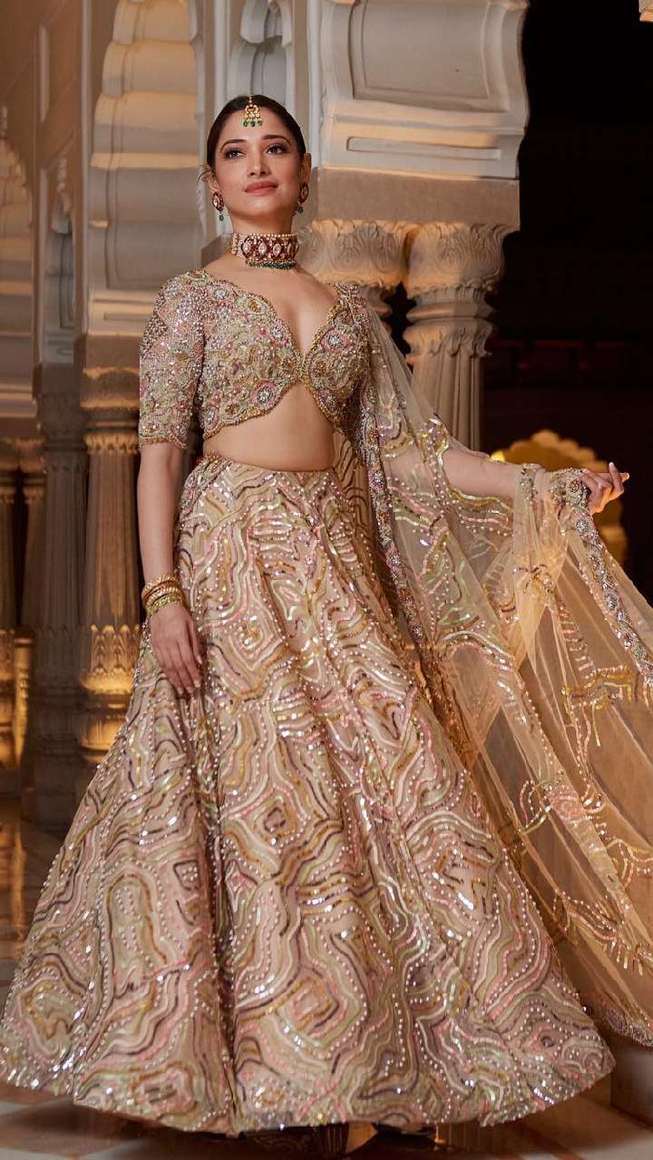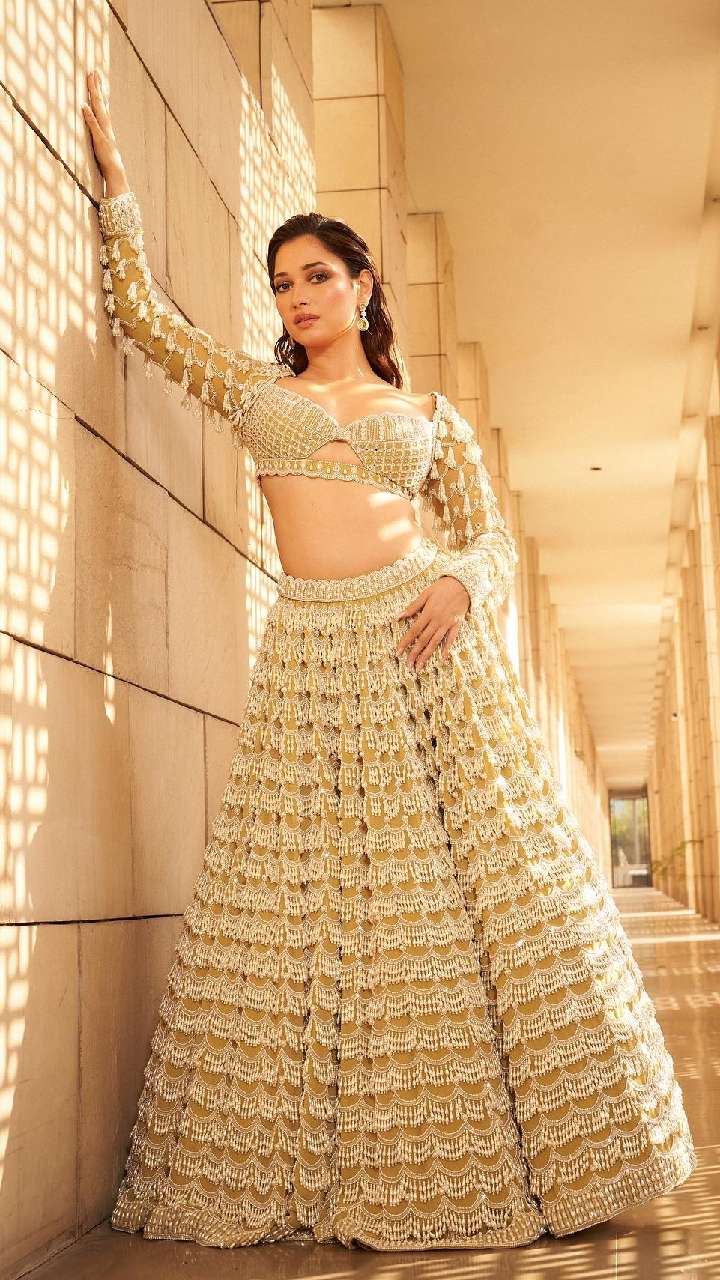 तमन्ना भाटिया का गोल्डन शिमरी वर्क लहंगा बिकिनी कट चोली के साथ बन हेयर स्टाइल शानदार लुक दे रही है। इसमें आप रॉयल दिखेंगी।