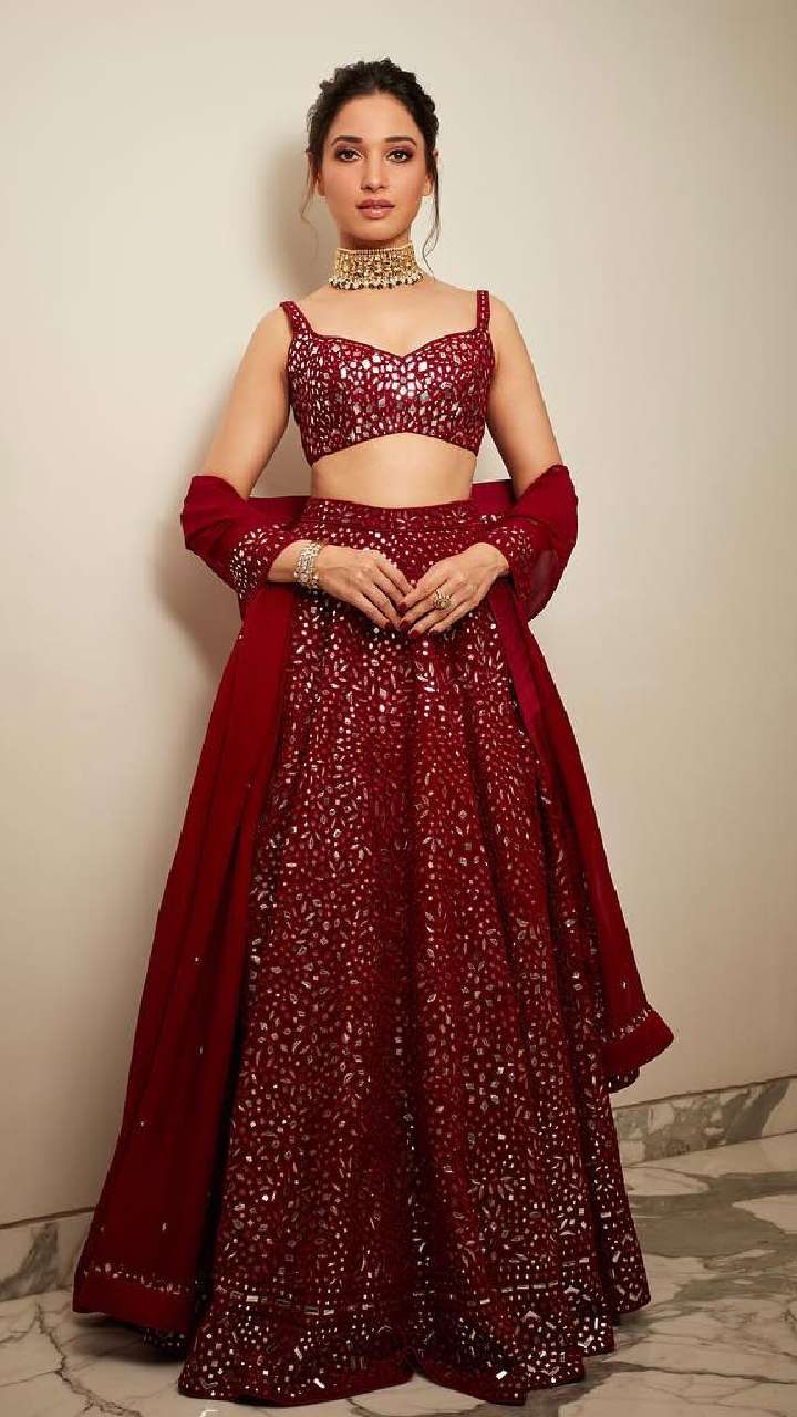 अभिनेत्री का मरून मिरर वर्क लहंगा स्वीट हार्ट नेक चोली आपको बेहद खूबसूरत बना देगी। इसमें आपकी हर कोई तारीफ करेगा।