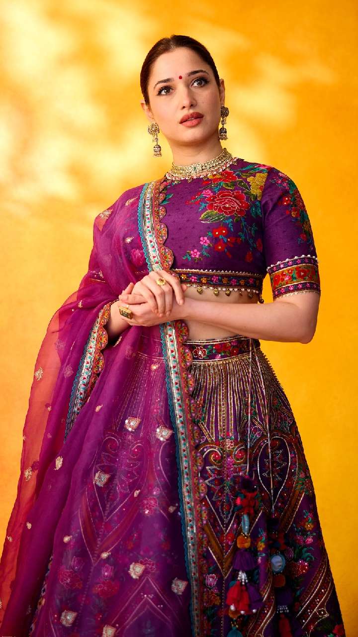 हाल में अभिनेत्री ने फ्लोरल वर्क वाले पर्पल कलर के बनारसी लहंगे में अपने लेटेस्ट लुक से इंटरनेट पर तहलका मचा दिया है। इसके साथ डीवा ने हाई नेक चोली पहनी है।