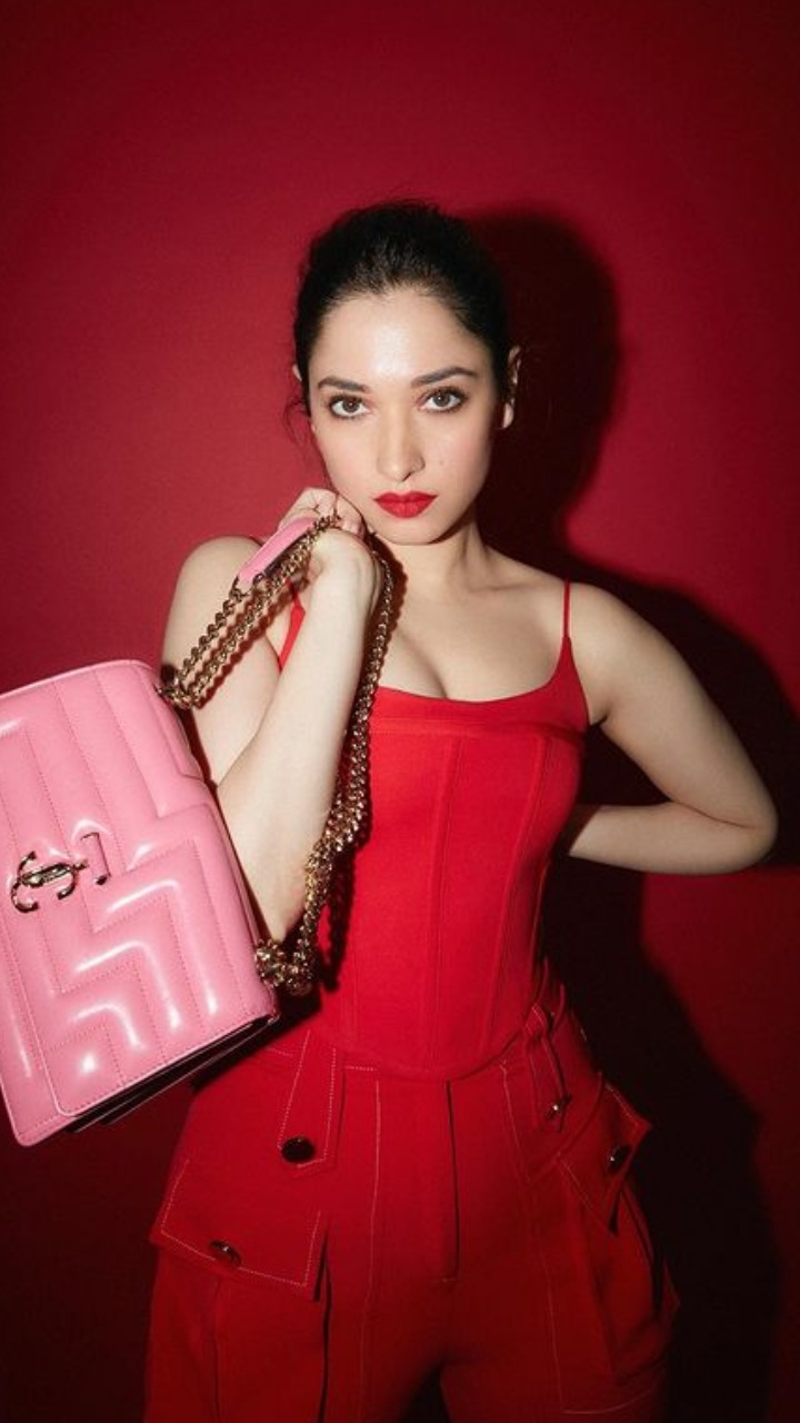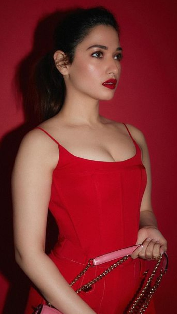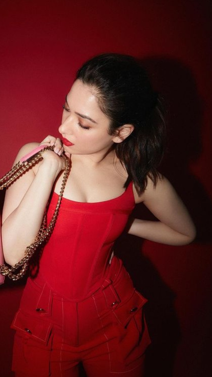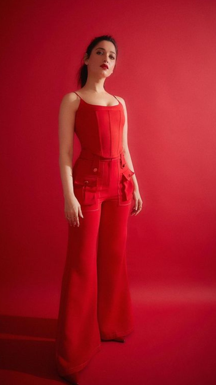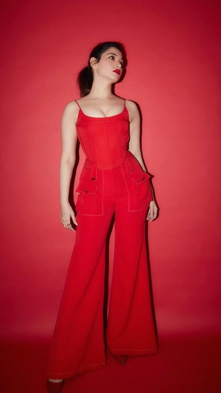 तमन्ना भाटिया ने रेड कलर का वाइड लेंथ पेंट और रेड स्ट्रिप टॉप पहना है।