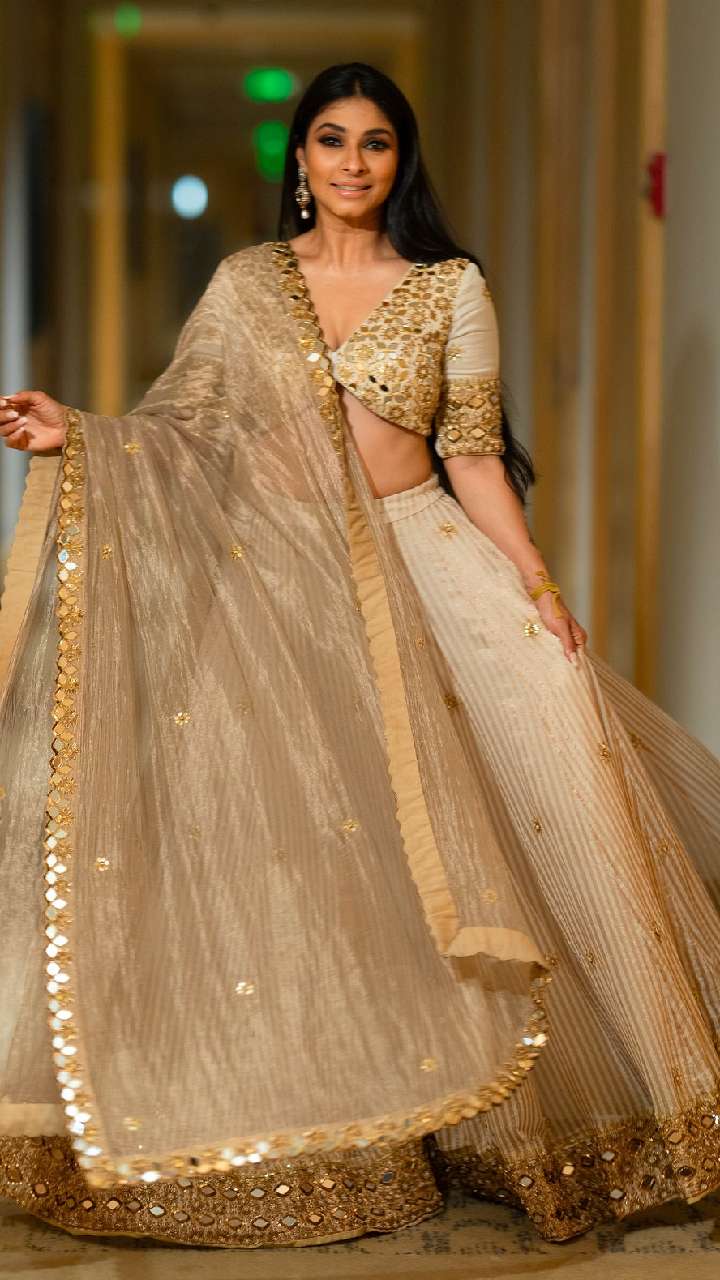 हाल में डीवा ने ऑफ व्हाइट गोल्डन वर्क लहंगे बिकिनी कट चोली में अपना लेटेस्ट गॉर्जियस लुक शेयर किया है। जो आपके वेडिंग लुक में चार चांद लगा देगा।
