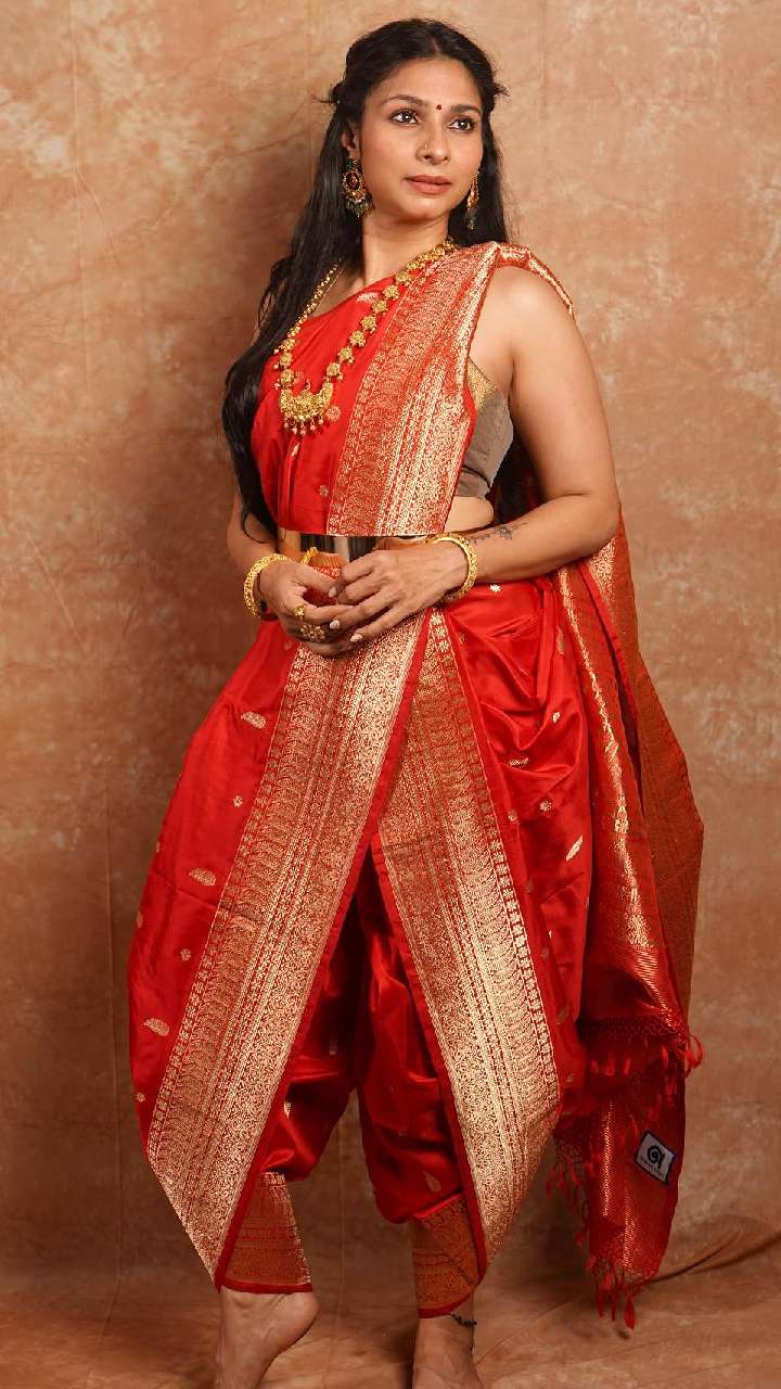 इस दिवाली आप इस तरह की बनारसी साड़ी कंट्रास्ट कलर वी नेक ब्लाउज को एक्ट्रेस की तरह ड्रेप कर सकती हैं।