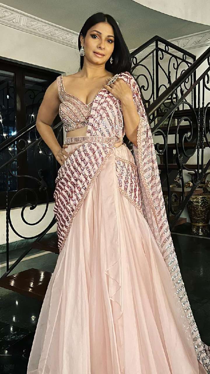 इस बेबी पिंक शिमरी ब्लाउज लहंगे में डीवा एकदम बार्बी डॉल लग रही हैं। आप इस ओवरऑल लुक को कॉपी कर सकती हैं।